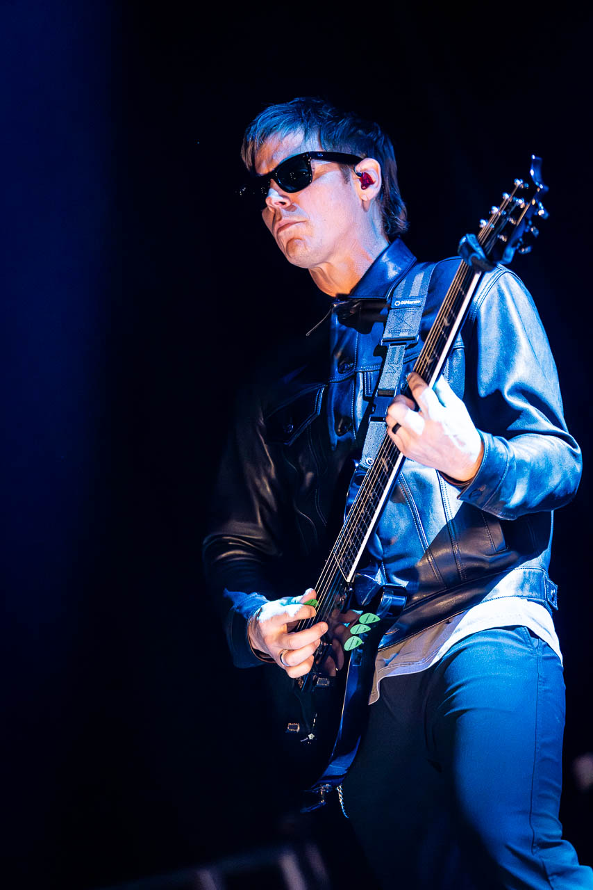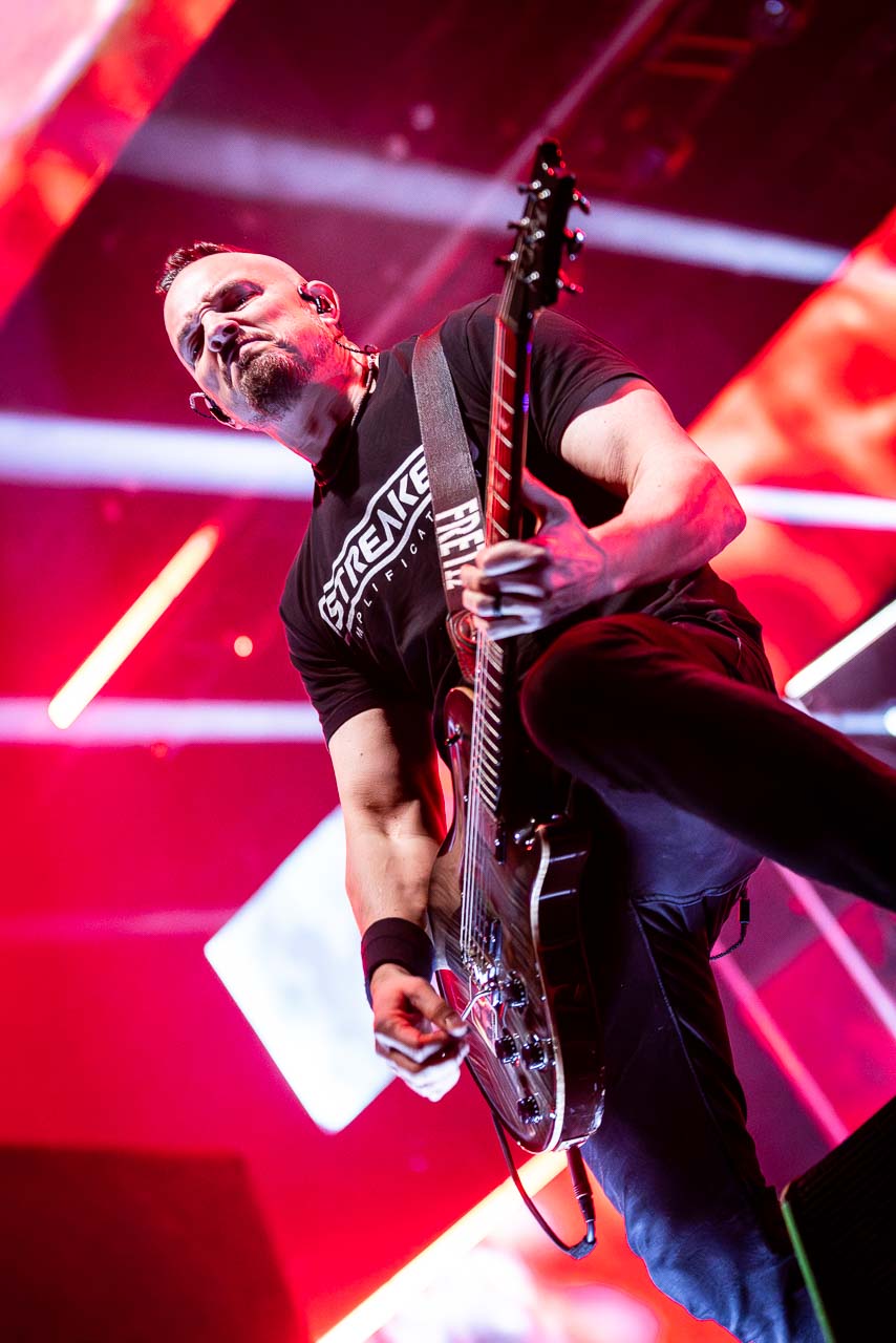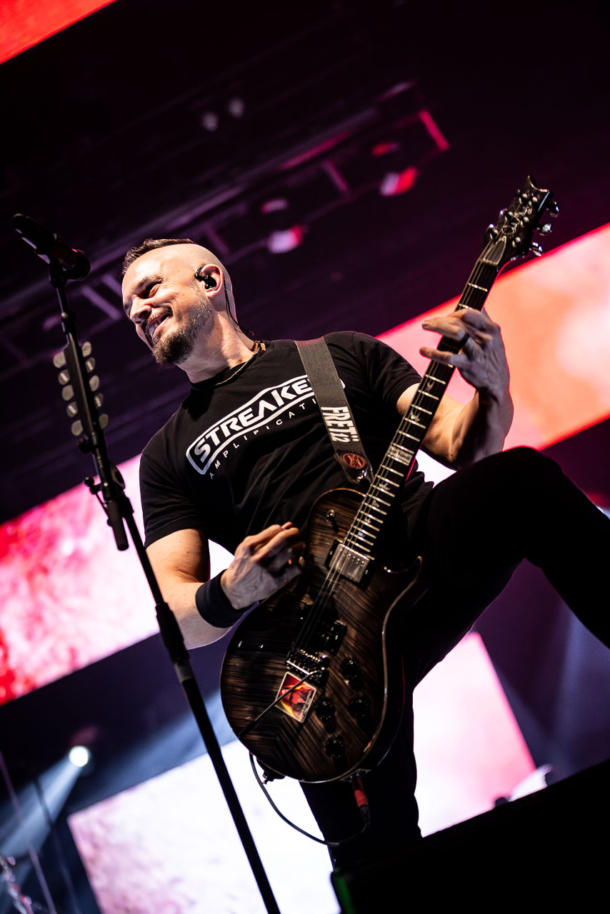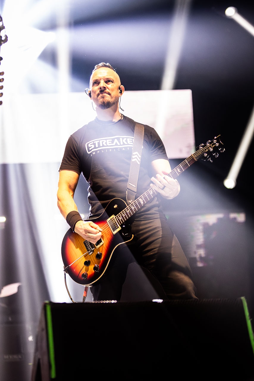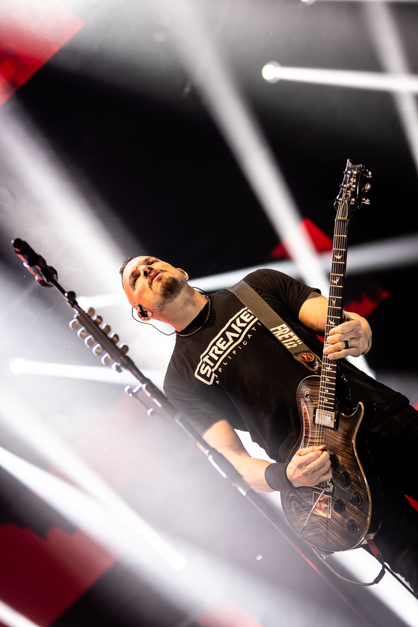But in all seriousness, I am looking forward to catching them live after all these years. I’ve seen Mark any time he’s been in Belfast, and Myles has passed through the city twice now and even once they were in the city within 48 hours of each other playing the same venue. 9:15 and the lights drop and one by one the gents take to the stage and kick in with their self-titled album’s opening track ‘Silent Divide’, and the 3Arena goes wild! The three songs in the pit whizz by, and once out, you get to appreciate the full scale of their touring setup. The stage bathed in glorious light, video screens serving as a collage, providing backlight, all while beams of light stretch out into the audience, bathing the 3Arena in a light akin to something from War Of The Worlds! Quite the sight!