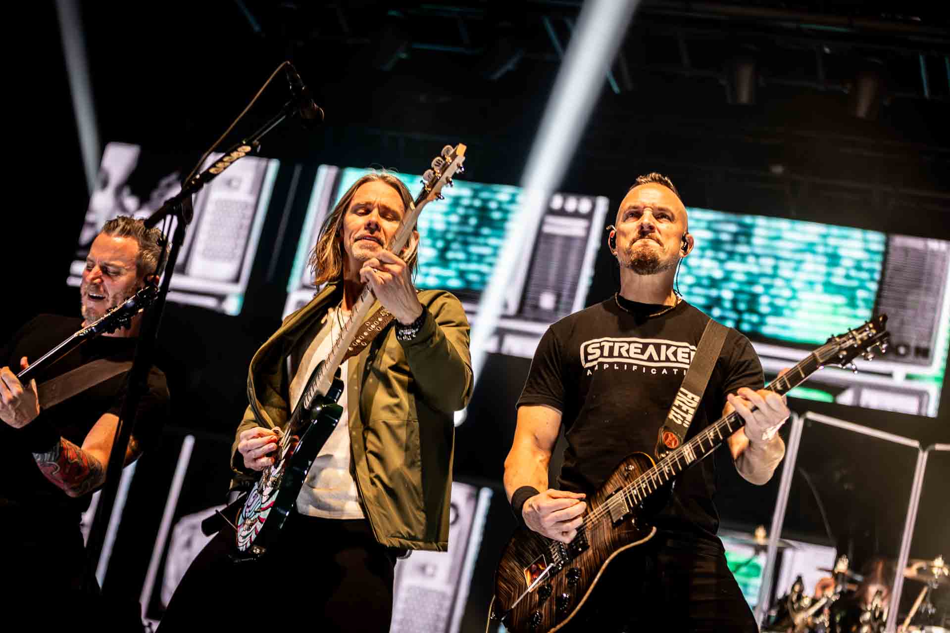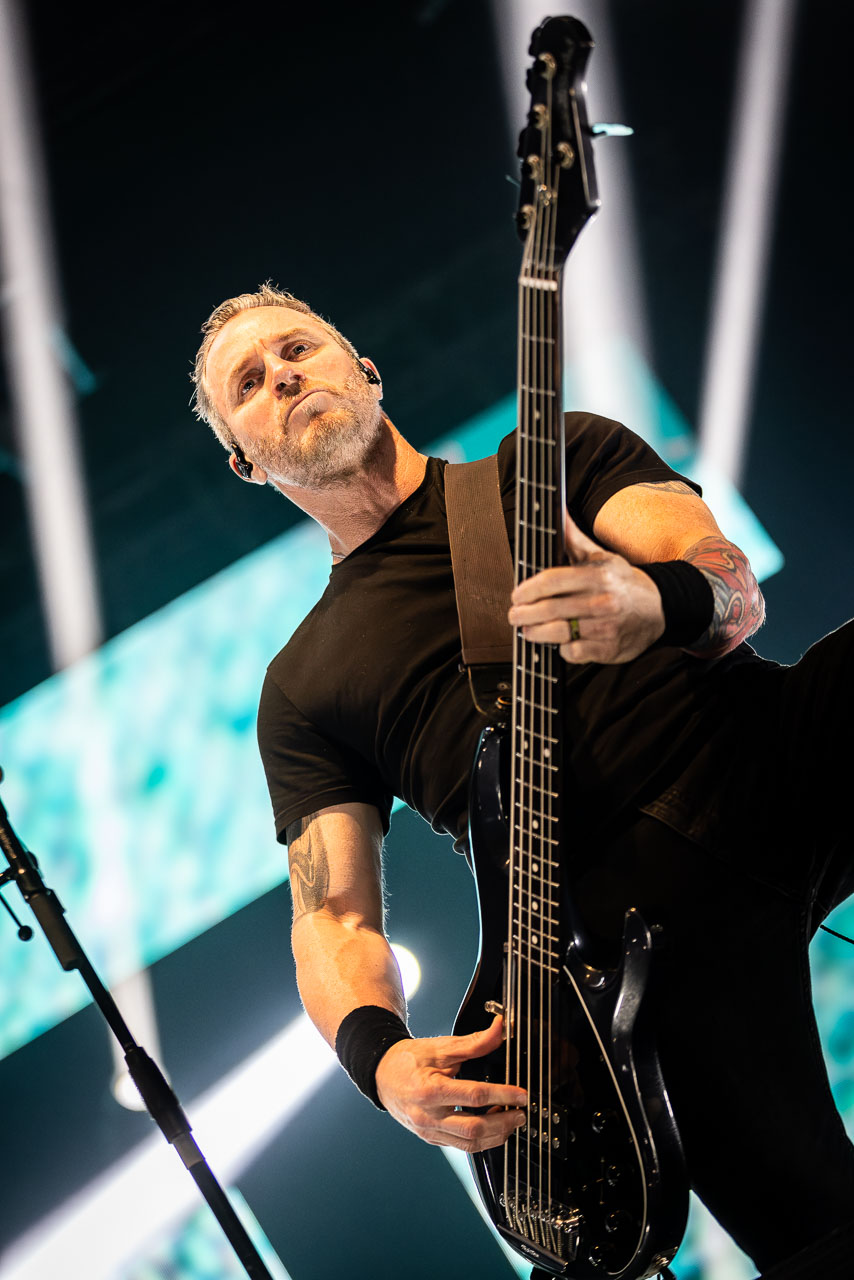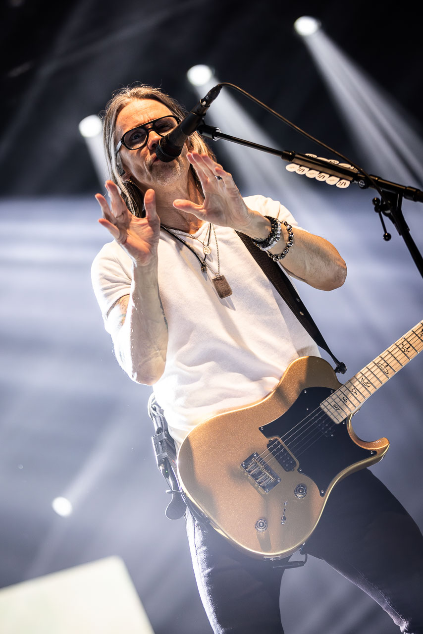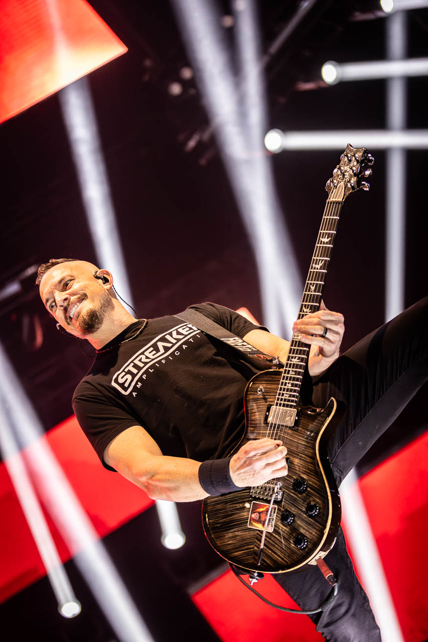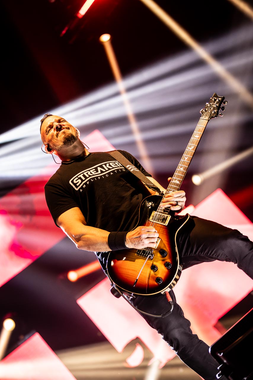 But in all seriousness, I am looking forward to catching them live after all these years. I’ve seen Mark any time he’s been in Belfast, and Myles has passed through the city twice now and even once they were in the city within 48 hours of each other playing the same venue. 9:15 and the lights drop and one by one the gents take to the stage and kick in with their self-titled album’s opening track ‘Silent Divide’, and the 3Arena goes wild! The three songs in the pit whizz by, and once out, you get to appreciate the full scale of their touring setup. The stage bathed in glorious light, video screens serving as a collage, providing backlight, all while beams of light stretch out into the audience, bathing the 3Arena in a light akin to something from War Of The Worlds! Quite the sight!