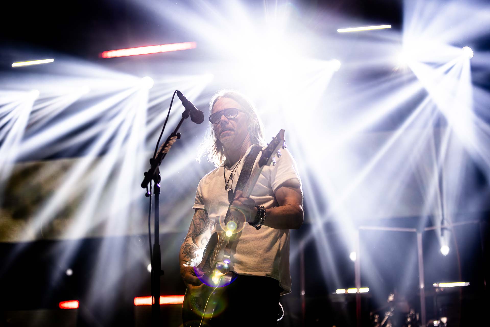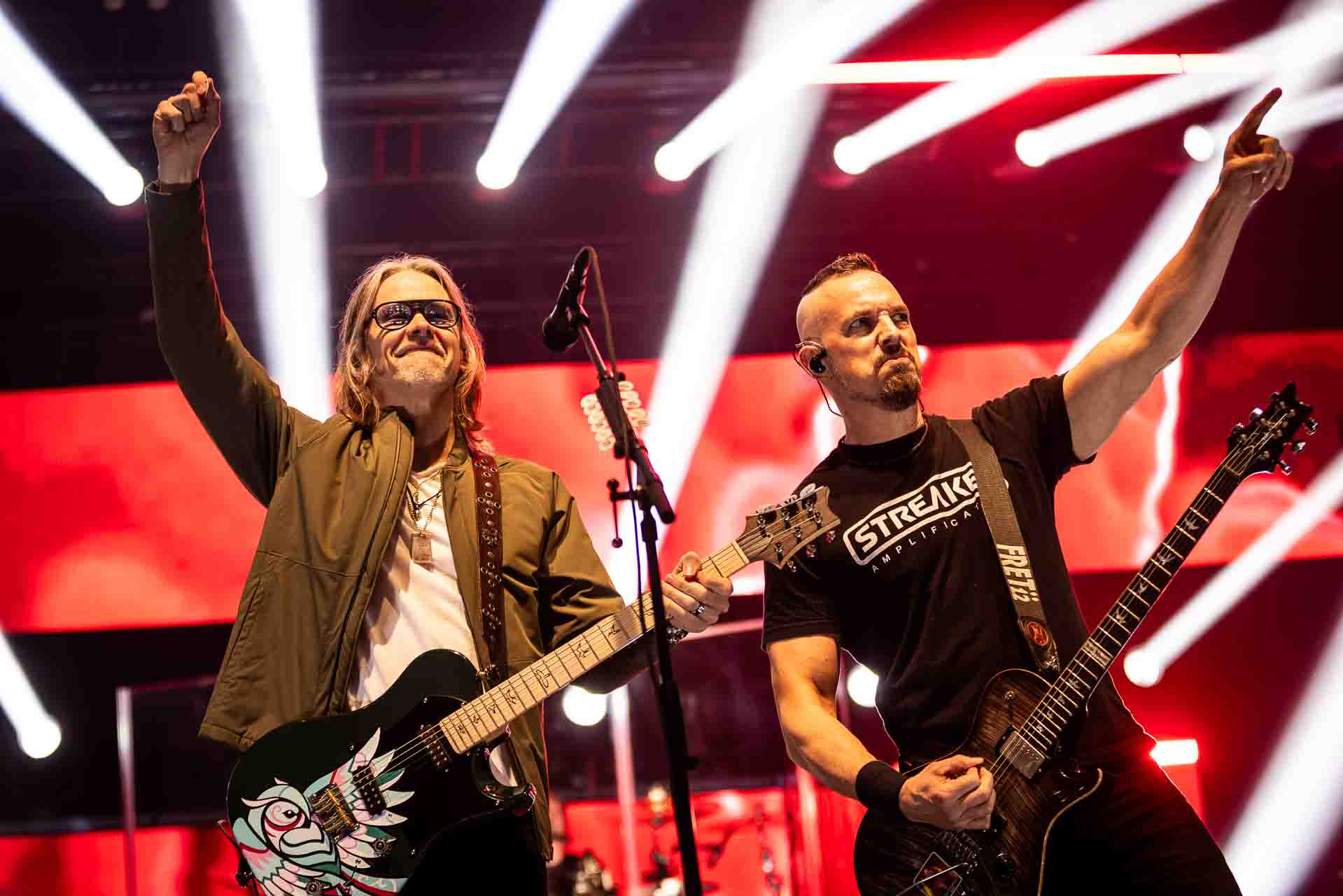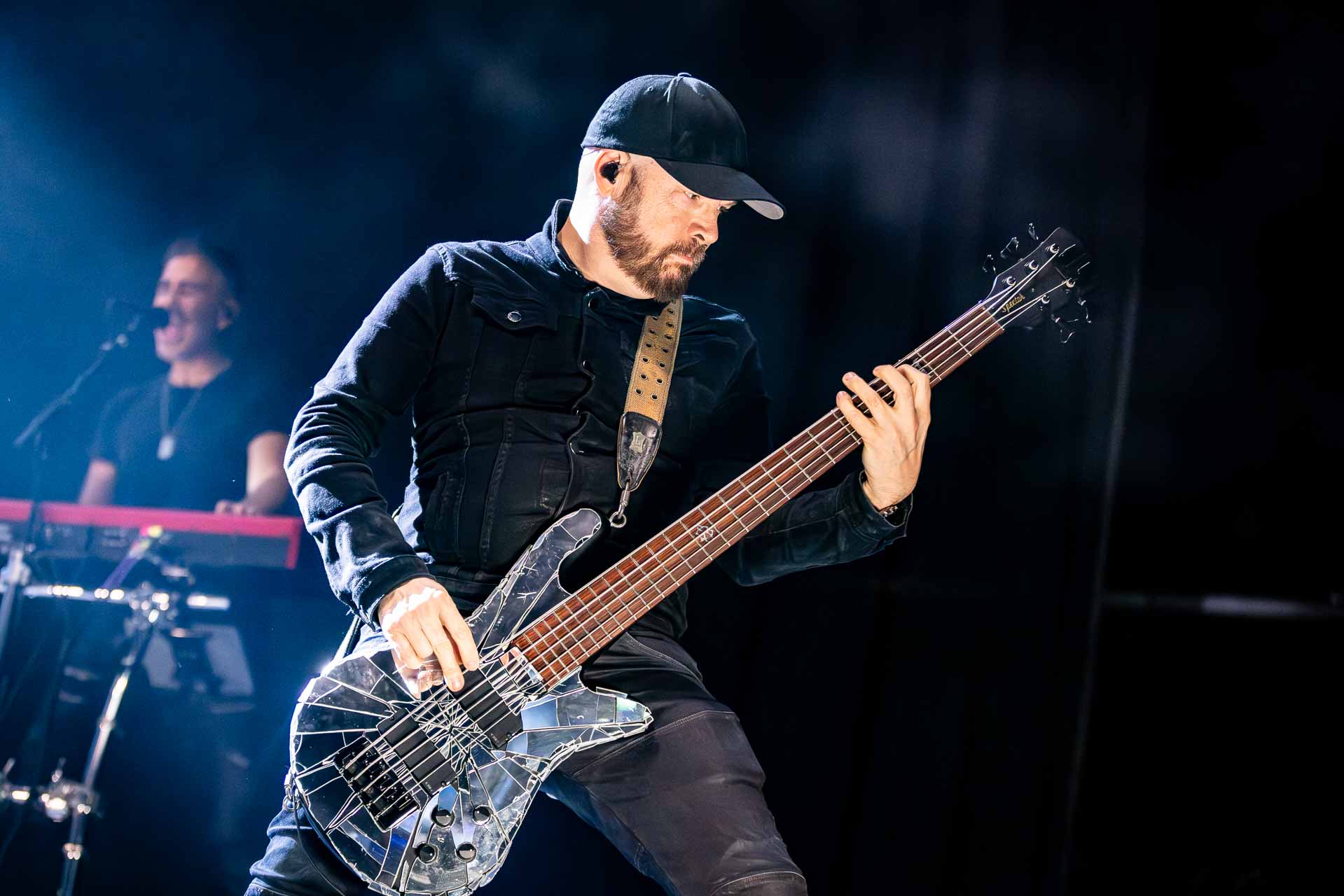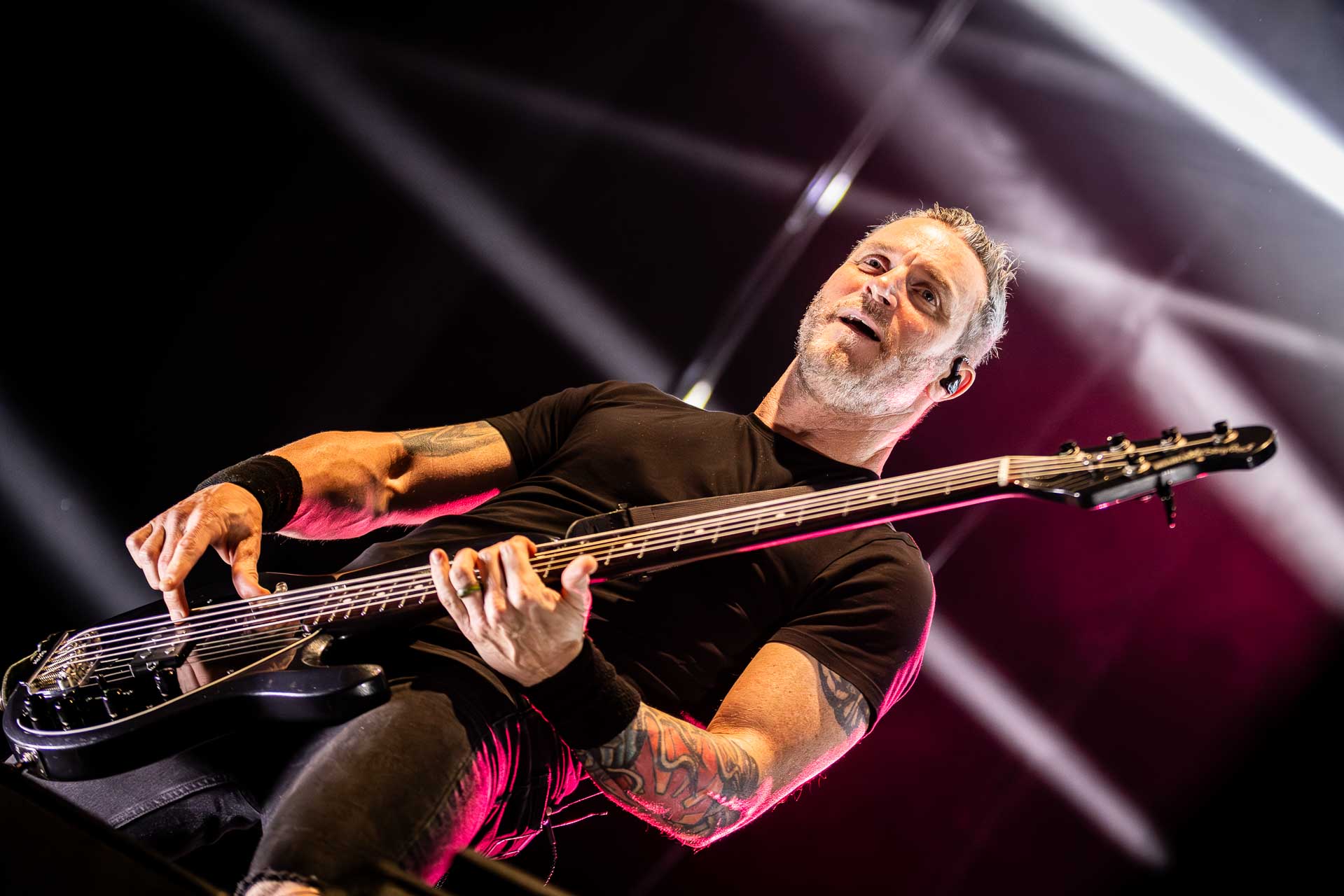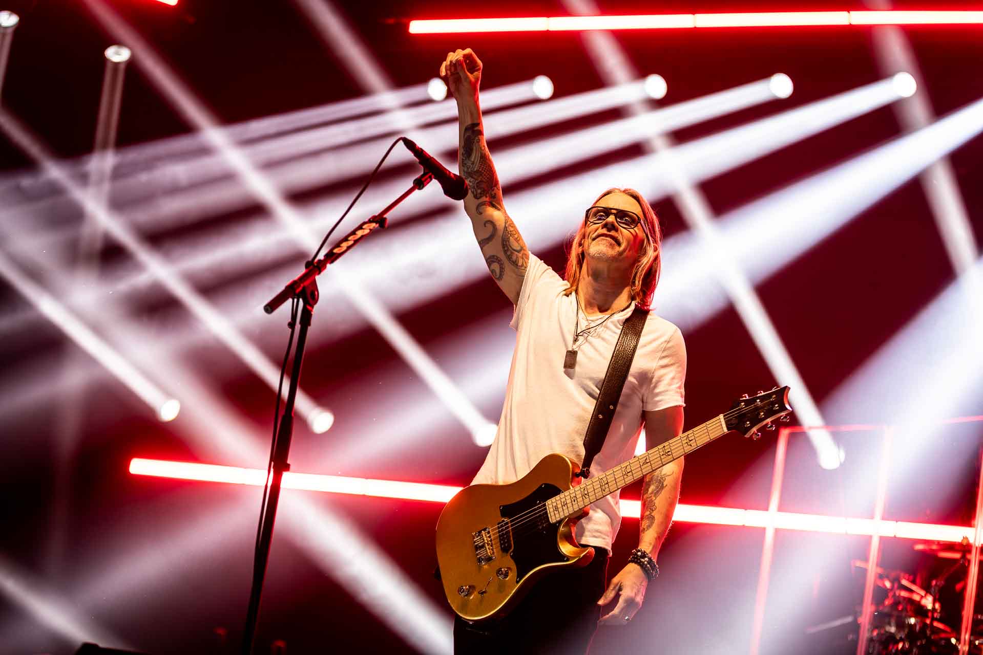 But in all seriousness, I am looking forward to catching them live after all these years. I’ve seen Mark any time he’s been in Belfast, and Myles has passed through the city twice now and even once they were in the city within 48 hours of each other playing the same venue. 9:15 and the lights drop and one by one the gents take to the stage and kick in with their self-titled album’s opening track ‘Silent Divide’, and the 3Arena goes wild! The three songs in the pit whizz by, and once out, you get to appreciate the full scale of their touring setup. The stage bathed in glorious light, video screens serving as a collage, providing backlight, all while beams of light stretch out into the audience, bathing the 3Arena in a light akin to something from War Of The Worlds! Quite the sight!