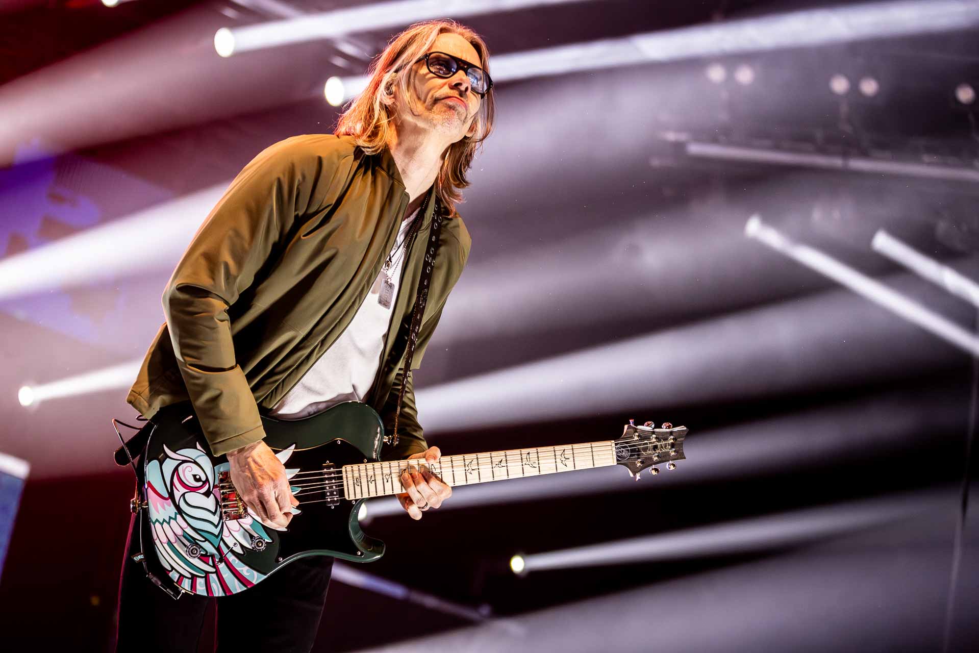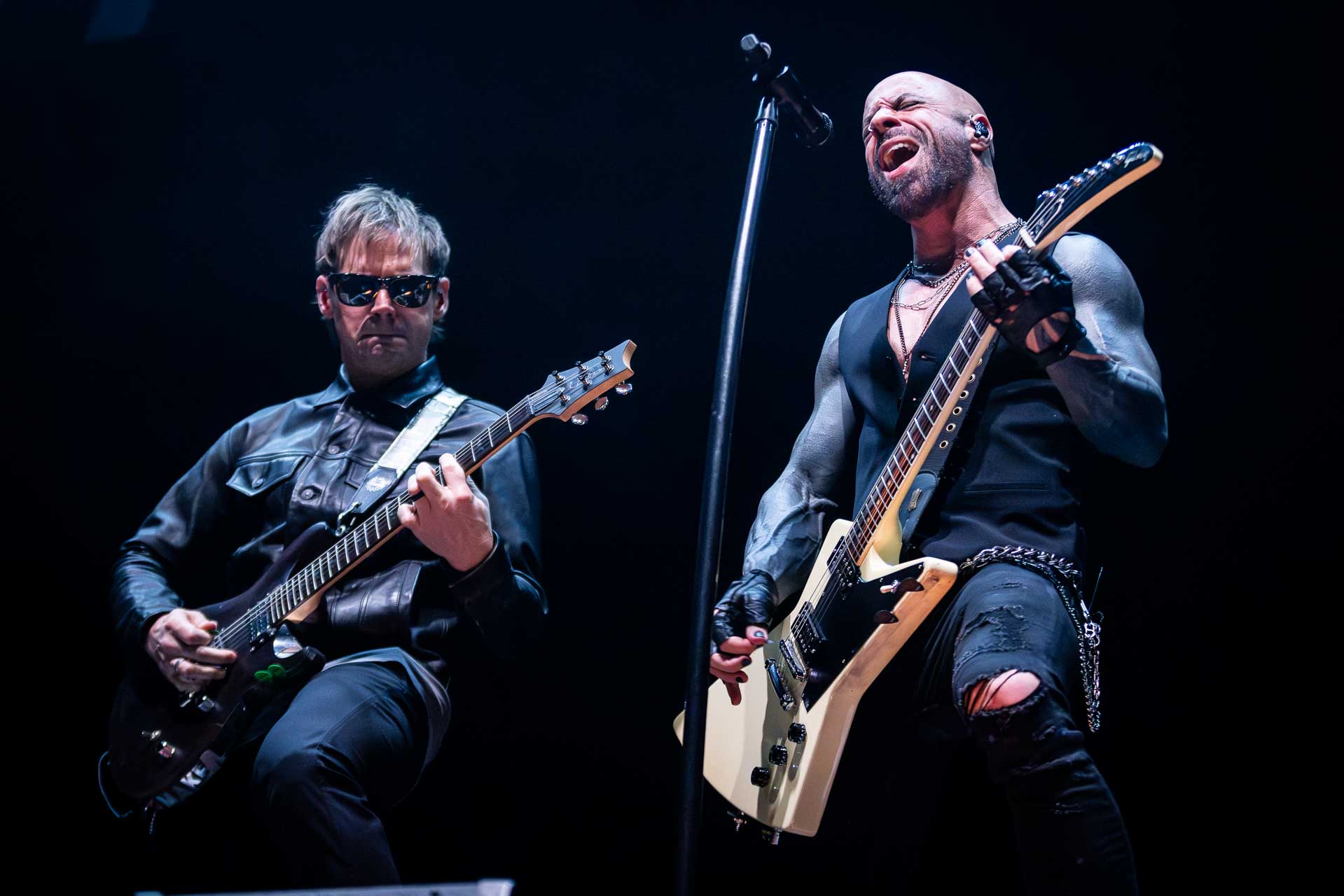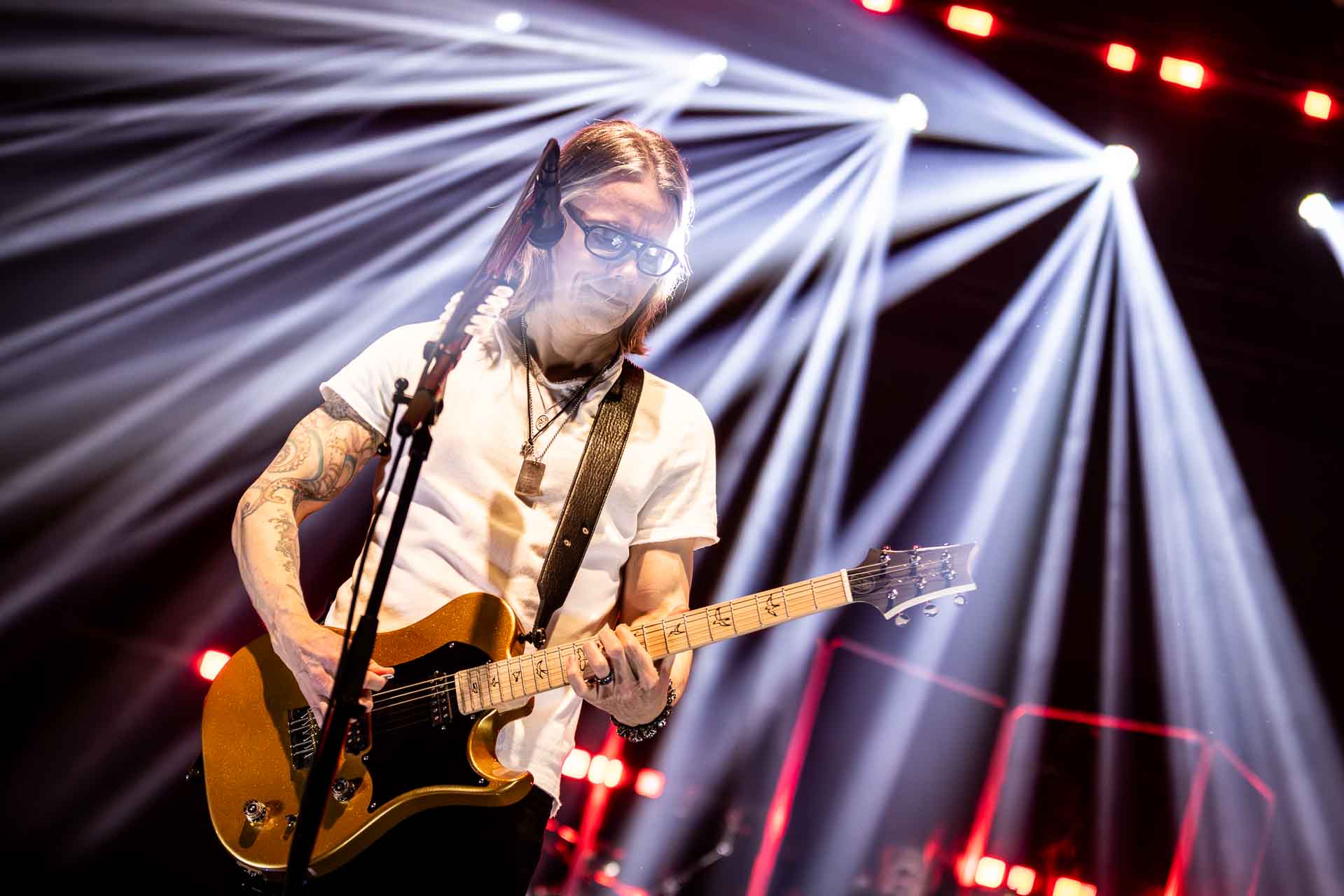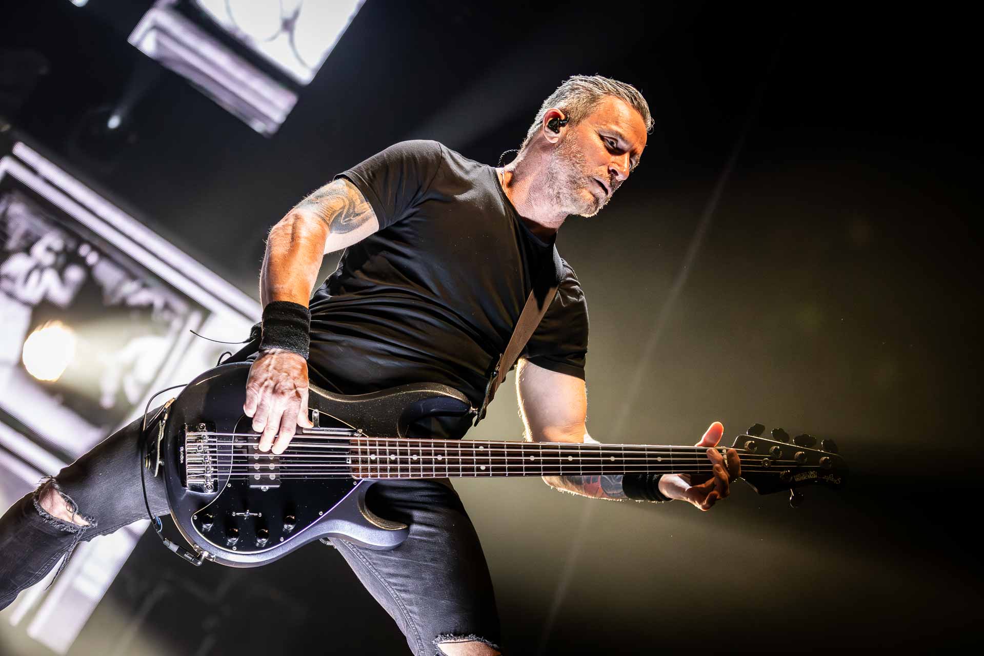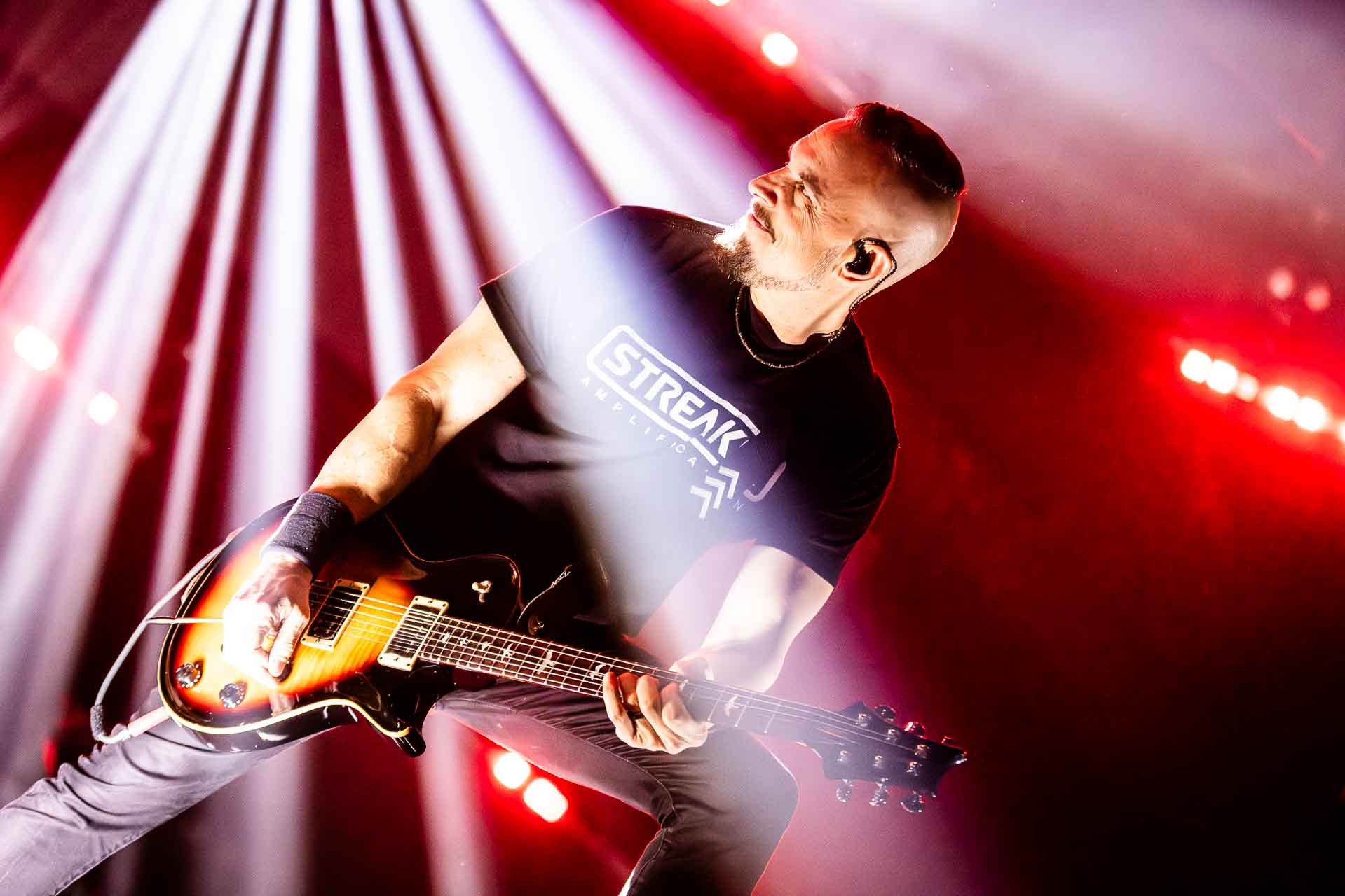 But in all seriousness, I am looking forward to catching them live after all these years. I’ve seen Mark any time he’s been in Belfast, and Myles has passed through the city twice now and even once they were in the city within 48 hours of each other playing the same venue. 9:15 and the lights drop and one by one the gents take to the stage and kick in with their self-titled album’s opening track ‘Silent Divide’, and the 3Arena goes wild! The three songs in the pit whizz by, and once out, you get to appreciate the full scale of their touring setup. The stage bathed in glorious light, video screens serving as a collage, providing backlight, all while beams of light stretch out into the audience, bathing the 3Arena in a light akin to something from War Of The Worlds! Quite the sight!