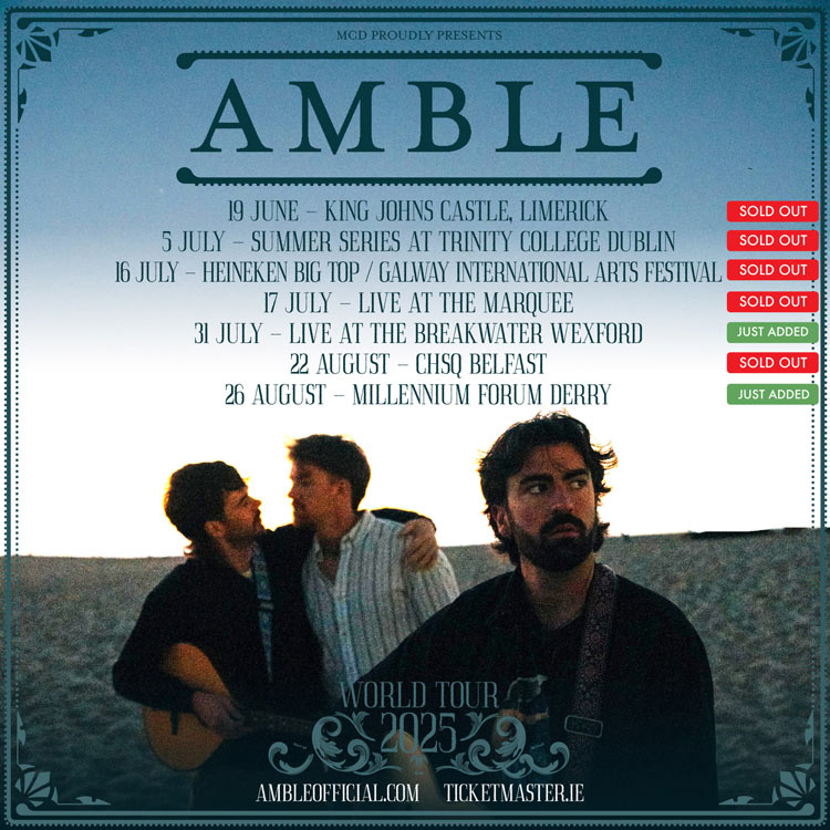 Irish folk trio Amble have announced two new headline shows for this summer, with performances at Live at the Breakwater, Wexford on 31st July and Millennium Forum, Derry on 26th August. These dates follow a strong run of sold-out performances in 2024 and as part of their ongoing 2025 tour which is also sold out. These two new dates sit alongside recent sell-outs later this year at Dublin’s Trinity Summer Series, Cork’s Live at the Marquee, Galway’s Festival Big Top, Belfast’s CHQ and Limerick’s King John’s Castle. These new shows come off the back of February’s announcement of Amble’s first Australian and New Zealand dates which saw tickets sell out within minutes.