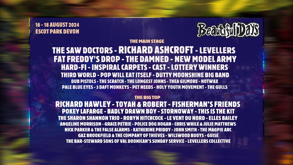 TOYAH & ROBERT, FISHERMAN’S FRIENDS, NEW MODEL ARMY, HARD FI, INSPIRAL CARPETS, BADLY DRAWN BOY, UTAH SAINTS AND MANY MORE Beautiful Days have announced the full line-up for their 21st year with names including Richard Ashcroft, The Saw Doctors, Levellers, Richard Hawley, Fat Freddy’s Drop, The Damned, Toyah & Robert, Fisherman’s Friends, Inspiral Carpets, Badly Drawn Boy, Utah Saints and many more. The festival has music and entertainment over six stages plus walkabout theatre, amazing site art, a huge children’s area, a vast selection of food and traders plus real ale bars run by Devon’s Otter Brewery. The festival is also well known for their colourful Sunday dressing up themes with the 2024 one still to be announced. Beautiful Days is the Levellers’ annual family music festival organised by Exeter-based DMF Music since its inception in 2003. Proudly independent, and a firm favourite on the Summer calendar, well over 50% of the tickets have already sold for the 2024 event. Headlining the Main Stage on Friday night are acclaimed Irish legends The Saw Doctors. Discovered by Mike Scott from The Waterboys at a show in Galway in the late 80s, their single ‘I Useta Lover’ hit number one in Ireland in 1990 and remains one of the best-selling Irish singles of all time. Loved and revered by their fans, they staged a triumphant comeback in 2023 after a five-year break in touring. The festival’s Saturday headliner is two-time Ivor Novello winner Richard Ashcroft. Frontman with The Verve in the 90’s, they released one of the biggest albums of the era in the shape of ‘Urban Hymns’ (the UK’s 18th biggest selling album of all-time) as well as a succession of anthems which remain staples of his live set today including ‘The Drugs Don’t Work’, ‘Bittersweet Symphony’ and ‘Lucky Man’. Richard has released five Top 5 solo albums, including most recent ‘Acoustic Hymns’ which reached #2 in the UK Album Charts in 2022. Levellers, as always, headline the Main Stage on the Sunday to close the weekend with a hit-rich set followed by the traditional firework spectacular. The band will also open the festival with a Levellers Collective acoustic set playing different arrangements of their songs including some released on recent album ‘Together All The Way’. Also playing on the Main Stage are New Zealand’s soul machine Fat Freddy’s Drop. The seven-piece are internationally regarded as one of the world’s finest live performers and renowned for their bold and electric energy. The Damned have brought their 80’s line-up back together in 2024 with Rat Scabies joining Captain Sensible, David Vanian and Paul Gray. With 12 studio albums and several UK chart singles, the band are true pioneers who emerged from the London punk scene. Formed in Bradford in 1980, New Model Army are storming through their fifth decade and show no signs of letting up. They are currently riding high with their recently released 16th new studio album ‘Unbroken’. Influential four-piece band Hard-Fi recently returned to the live scene after a lengthy hiatus. At their peak, the Staines rockers sold over a million copies of 2005 debut ‘Stars Of CCTV’ and were nominated for the Mercury Prize. A vital component of the infamous ‘Madchester’ movement, Inspiral Carpets are known for hit singles such as ‘This Is How It Feels’, ‘Saturn 5’ and ‘She Comes in the Fall’. The festival also welcome indie rock band Cast led by frontman John Power. Their classic album ‘All Change’ which features the hit singles ‘Alright’ and ‘Finetime’ is approaching its 30th anniversary in 2025. Also on the Main Stage bill are Lottery Winners who hit #1 in 2023 with their fifth album ‘Anxiety Replacement Therapy’ helping them quickly become one of the UK biggest and best live bands. Reggae ambassadors Third World – one of the longest-lived reggae bands of all time, and one of Jamaica’s most consistently popular crossover acts among international audiences – also appear on the Main Stage, as do Pop Will Eat Itself, who after disbanding and then briefly reforming have now returned full time to live shows and brand new material in 2024. Additionally announced are 13-piece massive Dutty Moonshine Big Band who boast big brass and even bigger bass, festival favourites Dub Pistols who are still firing on all cylinders after 25 years in the game, exciting and unique Dublin quartet The Scratch, Bristol-based sea shanty sensations The Longest Johns and Thea Gilmore, one of the most distinctive, strident and bold singer songwriters of her generation. Completing the Main Stage line-up are teenage punk powerhouse HotWax, South West electro-modernist guitar group Pale Blue Eyes, quirky and energetic 4-piece 3 Daft Monkeys, Pet Needs founded by brothers Johnny and George Mariott, Bristol 5-piece Holy Youth Movement and rock rebels The Gulls. Headlining Friday night on the festival’s second stage The Big Top is Mercury and Brit Award nominee Richard Hawley. Best known for his mix of classic songwriting, soothing vocals and northern grit realism, Richard is something of a unique artist in British popular music, able to cross boundaries from one musical style. Headlining Saturday night are music legends Toyah Willcox and Robert Fripp who have been married for nearly 40 years. With decades of iconic albums and hit singles between them, they connected with audiences worldwide online during the pandemic with the runaway success of their Sunday Lunch series. Sunday headliners in The Big Top are the original Cornish ‘buoy band’ The Fisherman’s Friends who have nine albums to their name, two feature films, a stage musical, a book, a TV documentary and they’ve played for royalty and to tens of thousands of fans over the years. Also on The Big Top line-up is Pokey Lafarge, a unique musician known for his vintage, old-timey sounds, he dabbles in everything from Americana to ragtime to folk to jazz