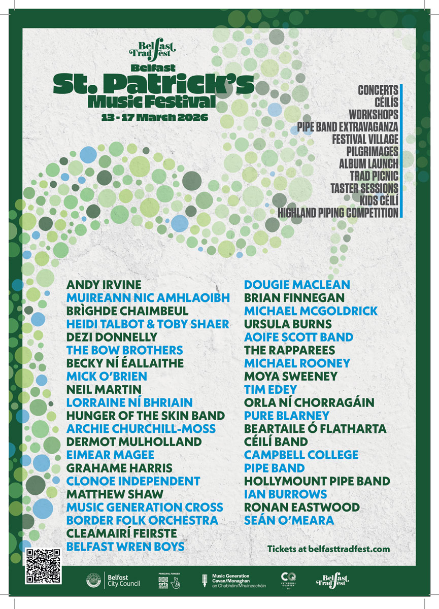 Belfast St Patrick’s Music Festival returns 13–17 March with five days of concerts, workshops, dance, pipe bands and a FREE Festival Village in the Cathedral Quarter in Belfast UNESCO City of Music