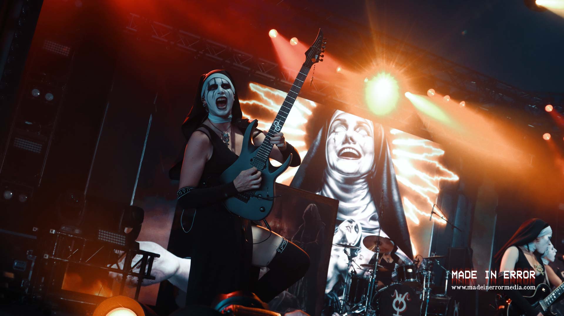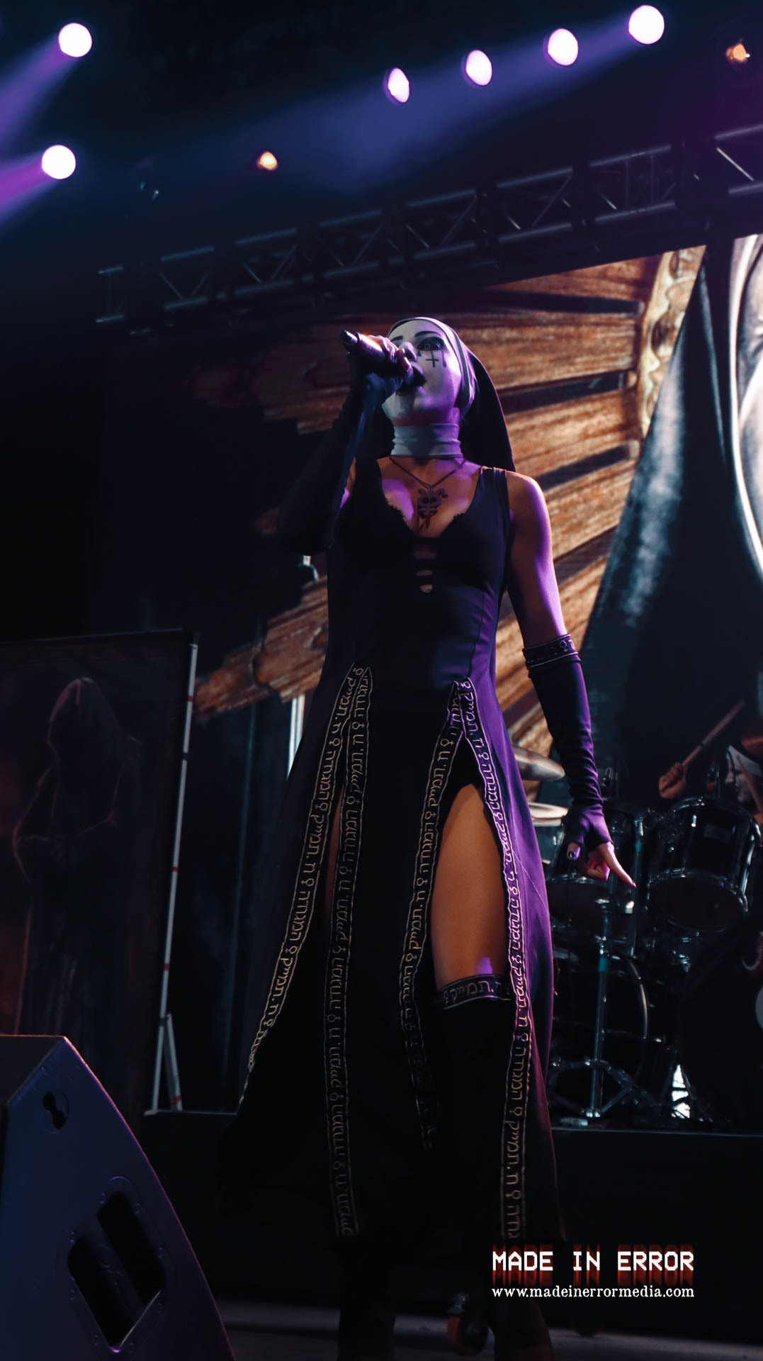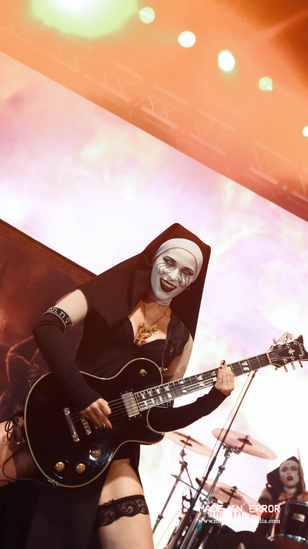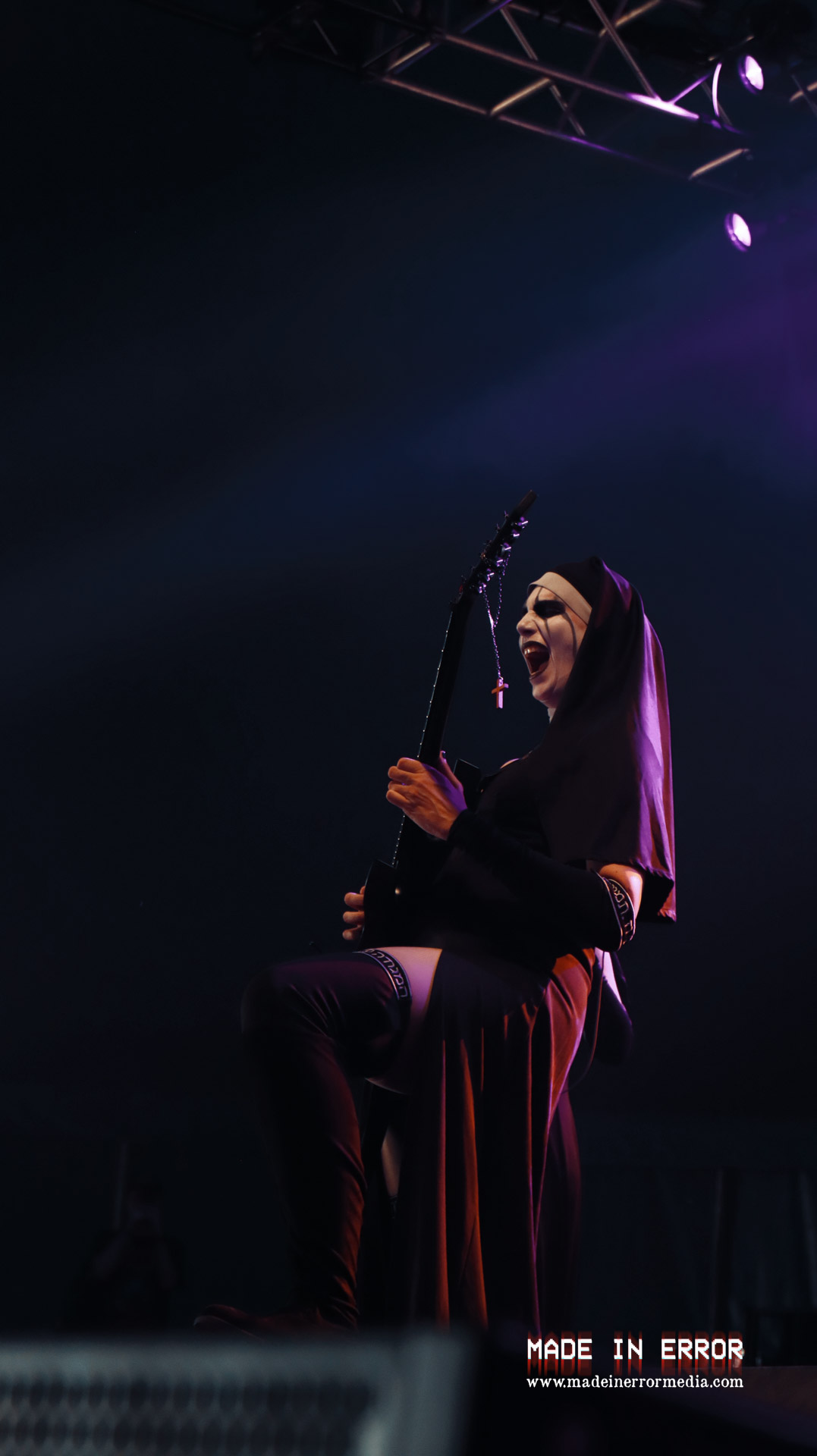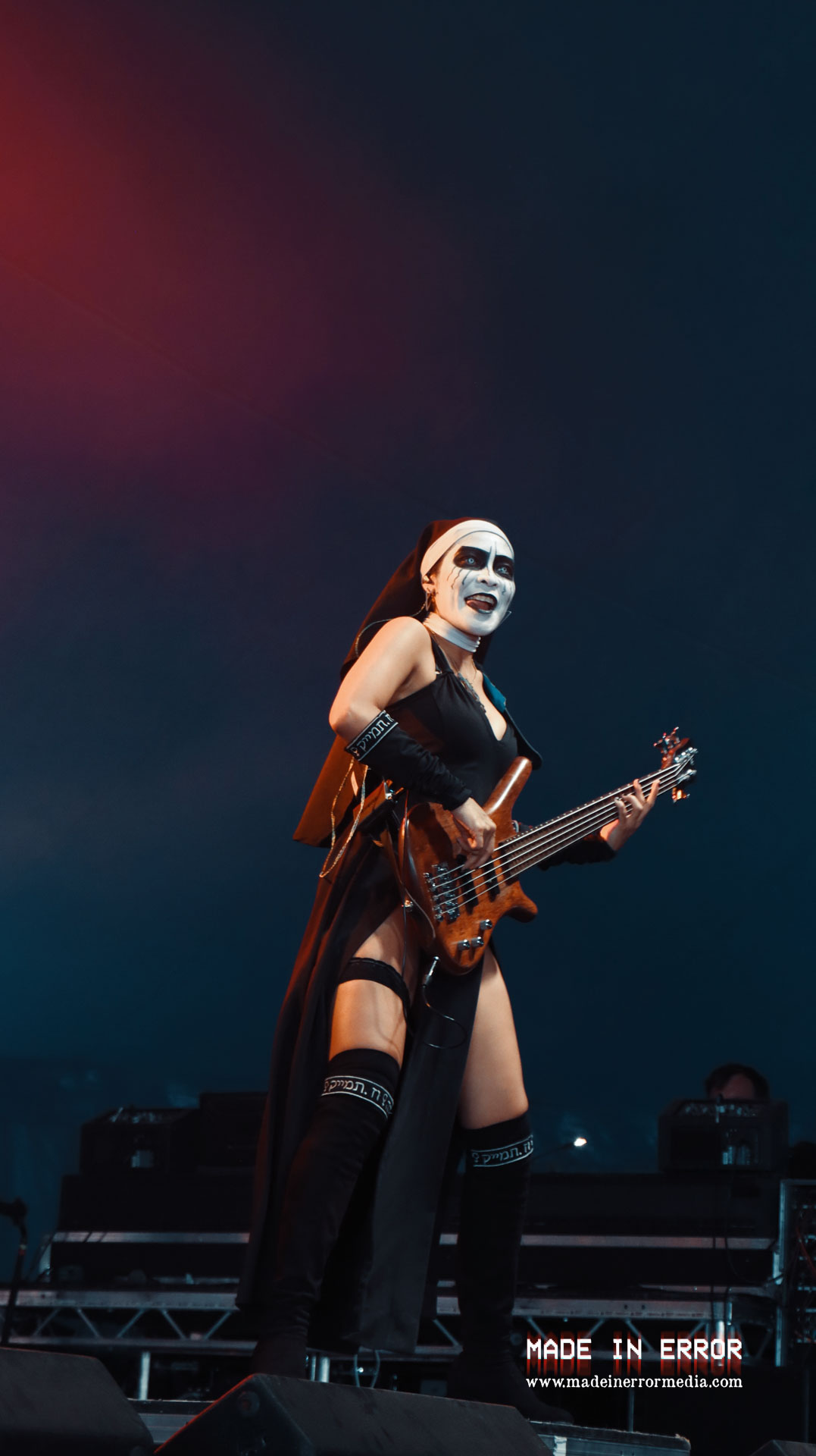 Dogma shifted the tone entirely. This all-female band has a concept that’s as striking visually as it is musically, dressing as “haunted nuns” with stage names pulled from villainous female icons in religious history. Their sound, a classic rock blend reminiscent of Within Temptation or Kamelot, had the packed tent in rapture. The audience interaction was next-level — every member making deliberate eye contact and working all sides of the crowd. Fans along the barrier were fully committed, some in painted faces and nun headpieces, turning the performance into a shared experience rather than just a set.