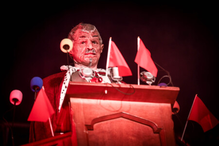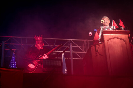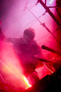 7:35 and the mighty King810 take to the stage – now we have to ask ourselves what are we in for here! There is a triple-height stage setup in the middle of the Sophie stage – almost too high to get any photos of and two cages down below wrapped in barbed wire one with a mic fixed in the middle, like what the actual fuck is going on! As 3 dodgy-looking characters take to the stage one clearly representing our glorious leaders the mantra of the great reset plays out over the pa – “You will own nothing and you will be happy” the fuck we will!