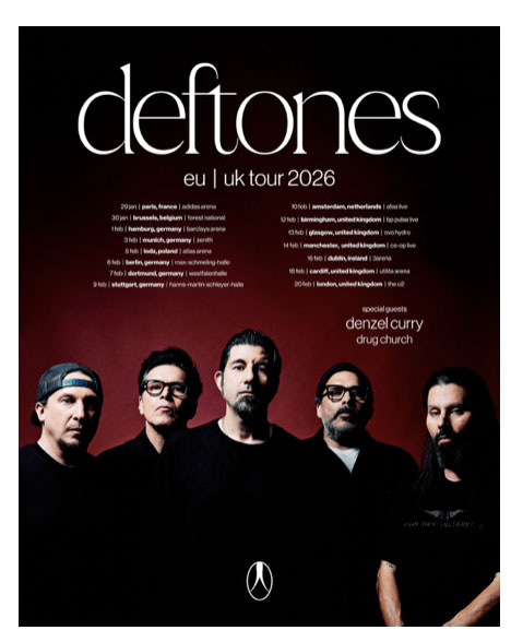 The 2026 EU/UK Tour kicks off January 29 at the Adidas Arena in Paris. It includes 15 shows across major cities, including Brussels, Berlin, Amsterdam, Manchester and Dublin, before wrapping at The O2 in London on February 20. Deftones will be joined by Denzel Curry and Drug Church as support across these dates. Full routing below.