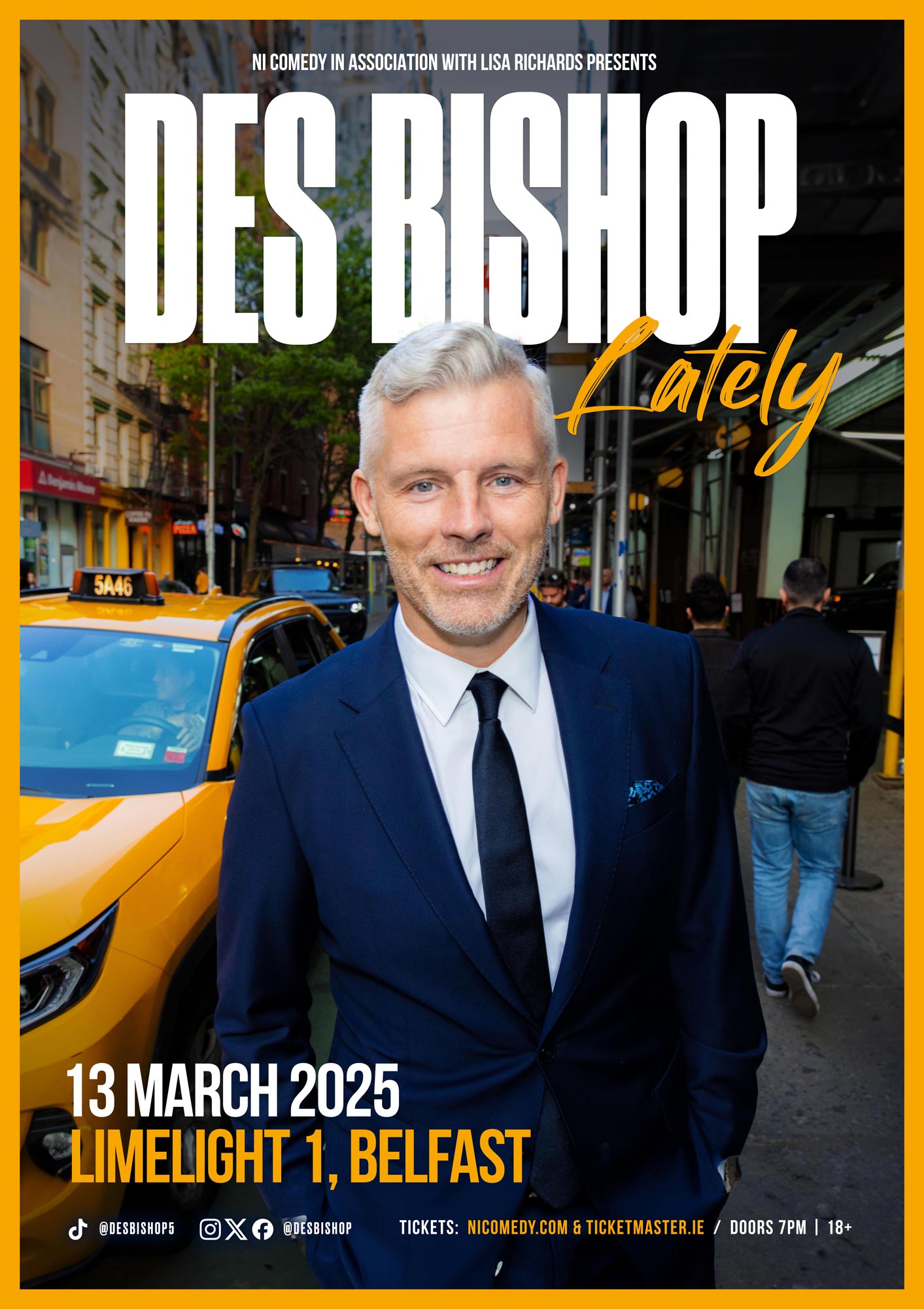 Des Bishop is back with his new show Lately. The world has changed, Ireland has changed and Des’s life has changed…A LOT. Lately is an hilarious, in your face standup show that talks about all this and more as Des tried to make sense of all the changes in his life and all our lives.