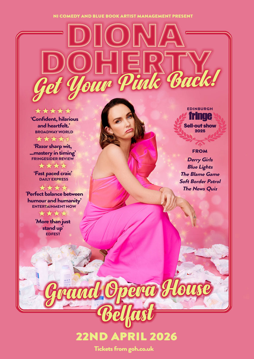 Derry comedian, actress, and writer Diona Doherty brings her sell out Edinburgh Fringe show to the Grand Opera House on 22nd April 2026 for one night only! Get Your Pink Back!, a funny and heartfelt show about motherhood, identity, and rediscovering joy. Known for roles in Blue Lights, Derry Girls, and Soft Border Patrol, Diona also writes and performs acclaimed theatre, including Bridesmaids of Northern Ireland and Sunny Side Up. A regular on BBC’s The Blame Game and Radio 4’s The News Quiz, she explores life after kids, IVF, and postnatal depression with humour and heart, proving she can still have fun — as long as it ends by 9pm.