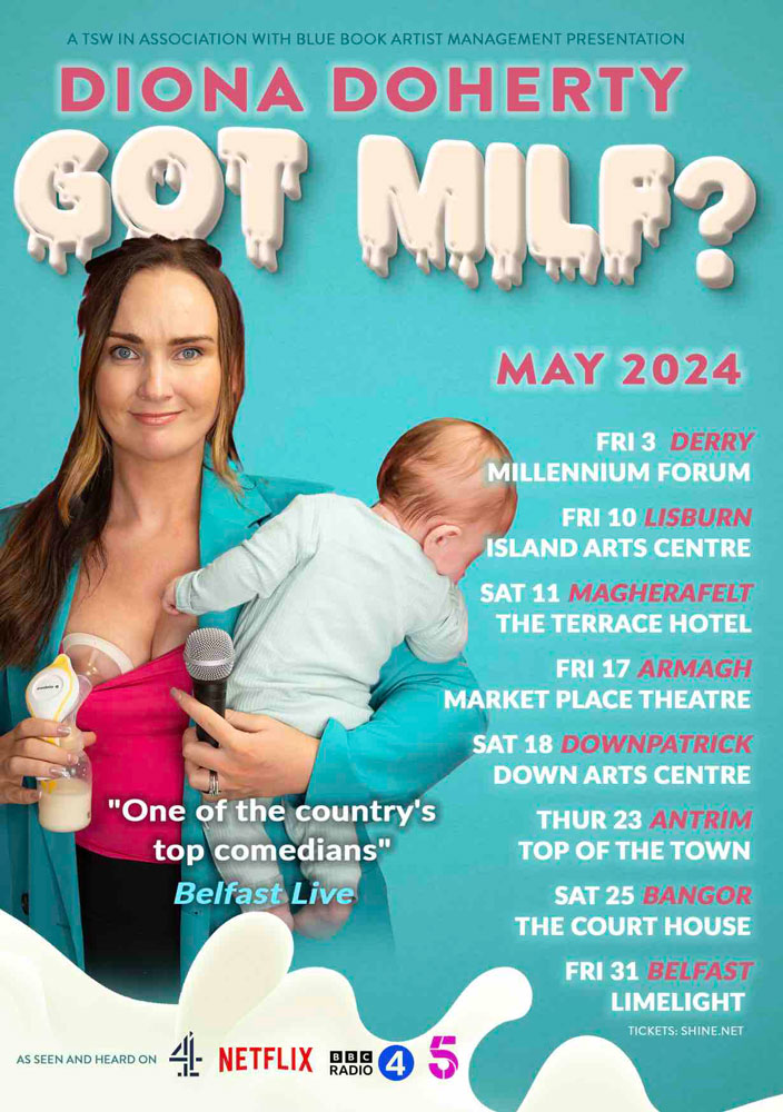 Star of Derry Girls, series regular on The Blame Game, Soft Border Patrol, The News Quiz, Breaking the News, Secrets of the Circuit, A Perforated Ulster and Give My Head Peace, Diona Doherty is taking a brand new show Got MILF? on her first ever stand up tour around the country.