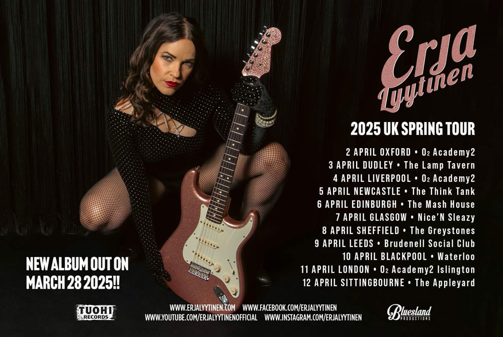 Photo by Arto Alho ERJA LYYTINEN SPRING 2025 UK TOUR TICKETS AVAILABLE FROM https://erjalyytinen.com/tourOxford, O2 Academy 2 Wednesday 2 April 2025 Tickets: TicketmasterDudley, The Lamp Tavern Thursday 3 April 2025 Tickets:Kate Shill PressLiverpool, O2 Acadmy 2 Friday 4 April 2025 Tickets: TicketmasterNewcastle, The Think Tank EventimEdinburgh, The Mash House TicketSourceGlasgow, Nice ’N Sleazy TicketSourceSheffield, The Greystones We Got TicketsLeeds, Brudenell Social Club SeeTicketsBlackpool, Waterloo SeeTicketsLondon, O2 Academy 2, Islington TicketmasterSittingbourne, The Apple Yard # # # ERJA LYYTINEN |