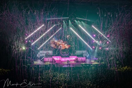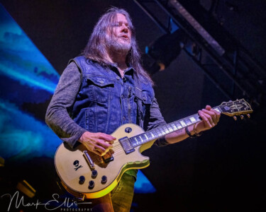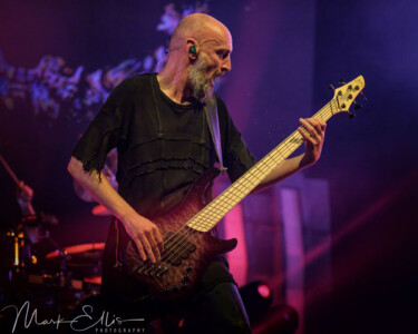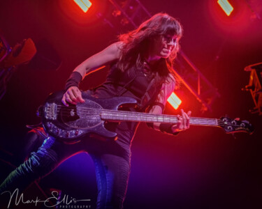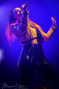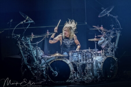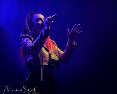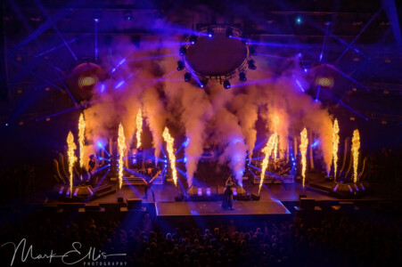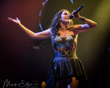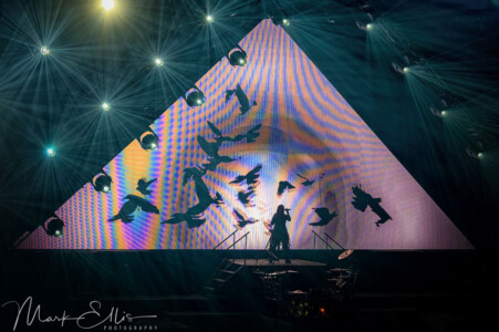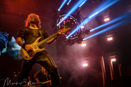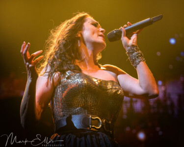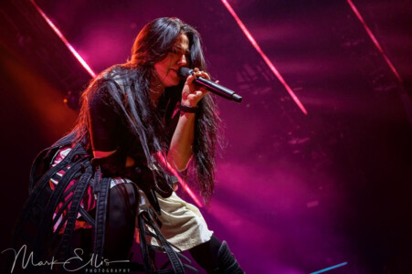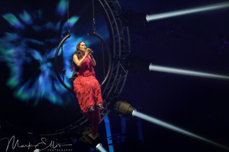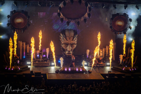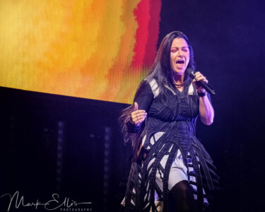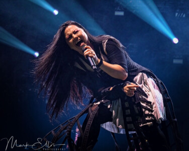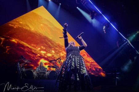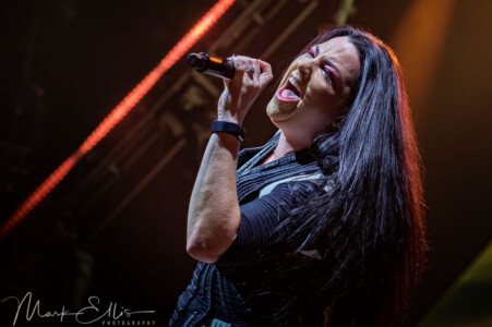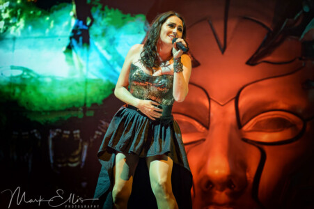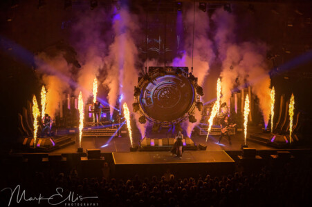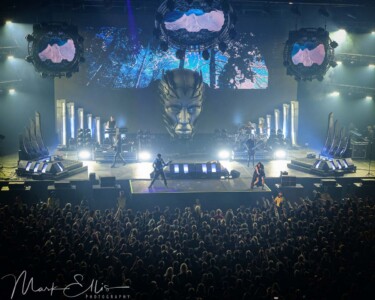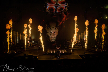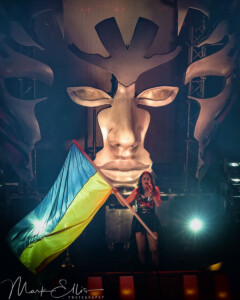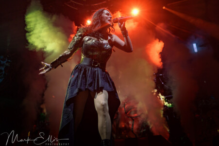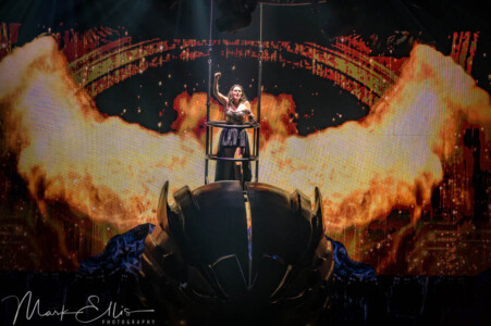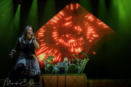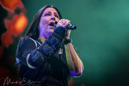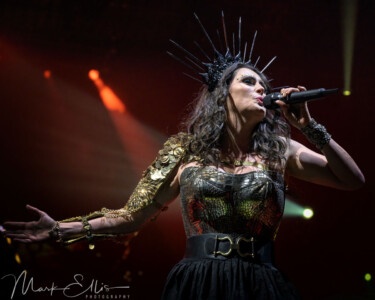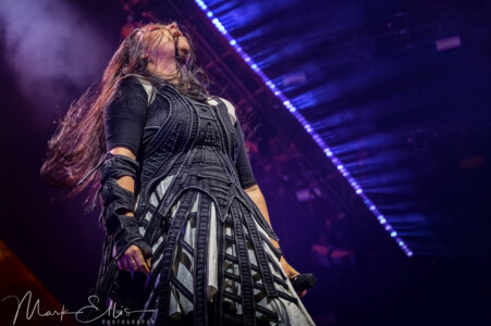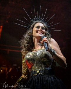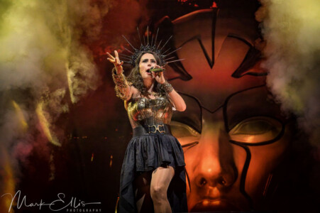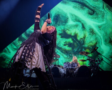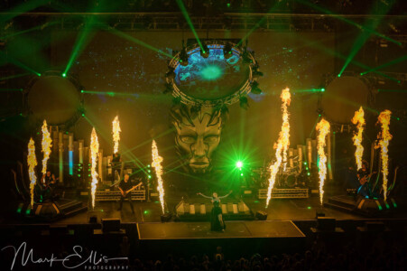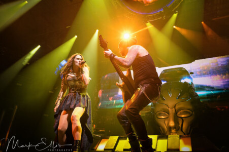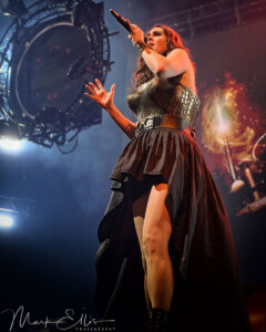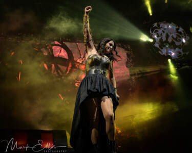 different energy to them as the band runs around the stage making the most of the set. This continues through “Faster” and “Paradise(What About Us?)” as the lighting rivals that of Evanescence. Throughout this, the lighting rig which had hidden Sharon at the start is now raised above the stage and playing the original song videos. As the set continues into “Angels”, Sharon is raised above the huge head that stands at the back of the stage as the floor is filled with smoke. The show keeps on giving though as the pyro kicks in for “Stand My Ground” and flames shoot from the stage. At this point Sharon takes a moment and asks the crowd if they would fight for their country as she dedicates “Raise your Banner” to Ukraine and brings a Ukrainian Flag out to wave as she performs to a backdrop of more flames. At the end of the song she comes forward to speak to a fan on the front row who is from the Ukraine and becomes speechless before saying how glad she is that they are here safe. As the show continues, there’s more spectacular pyro with which the crowd are encouraged to raise their hands in time. The band’s performance throughout tonight is outstanding as they perform hit after hit with incredible precision and energy. While these guys have brought a full stage show, it doesn’t distract from how talented this band are. Sharon’s voice is incredible live too as she moves from the heavy melodies to operatic tones. Even suspended high above the stage she hits every note as though her feet are on solid ground and this is even more impressive when she admits that she doesn’t like flying! As we head towards the end of the night, there’s time for another big sing along with “What Have You Done” before closing with “Ice Queen” and “Mother Earth”. It’s safe to say it’s been one hell of a show.