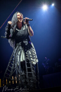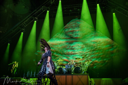 After a huge changeover on the stage, it’s time for Within Temptation to take over. Just looking at the stage, it’s clear we’re in for a very different performance from these guys. As the smoke fills the stage and video visuals begin, Within Temptation has a very different way of bringing the drama to the stage. As the main circular lighting rig lifts, Sharon Den Adel is ready to go behind it as they start the show with “See Who I Am”. These guys have a