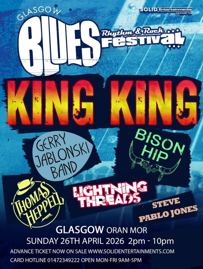 Leading British blues rock lights King King, following their seven-date acoustic tour, will play a hometown headline set at the Glasgow Blues Rhythm & Rock Festival at the Oran Mor on Sunday, 26th April. The eighth edition of the twice-yearly event features six bands, including the Scottish tandem of the high-octane Gerry Jablonski Band and fast-rising blues rock outfit Bison Hip, who were nominated in the UK Blues Awards for Best Emerging Act Of The Year. The festival line-up is completed by Steve Pablo Jones, the Lightning Threads and Thomas Heppel.