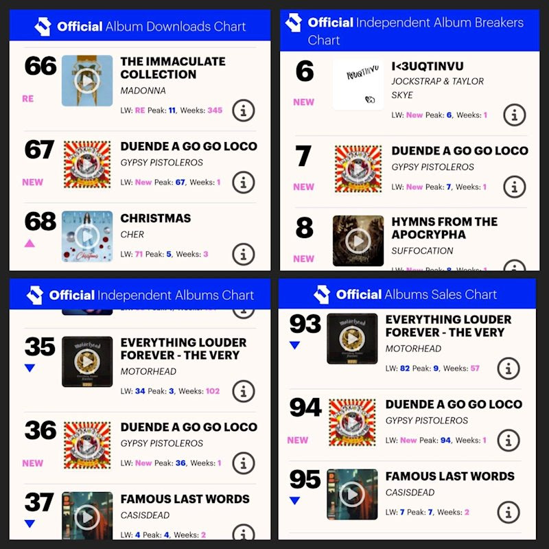 On Friday 10th of November, the Independent album from Gypsy Pistoleros, ‘Duende a Go Go Loco!’ was released via Earache Records and entered four Charts in total. The Chart revelation has prompted a new spike in sales, so there is a chance they may rise in the Chart next week!