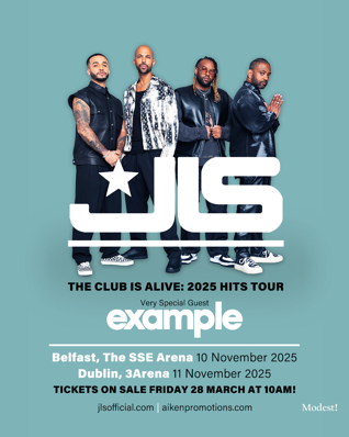 Tickets for JLS with very Special Guest EXAMPLE live in Belfast and Dublin go on sale Friday 28 March at 10AM from www.ticketmaster.ie