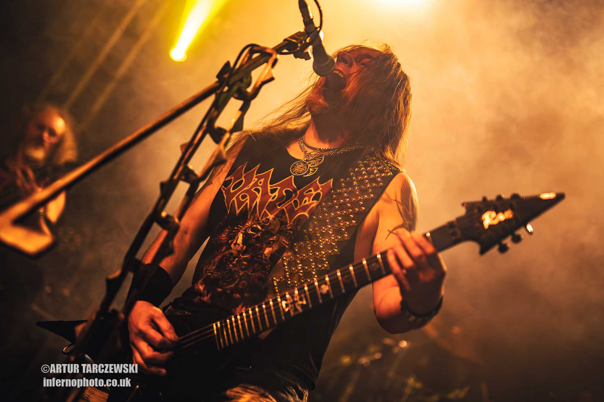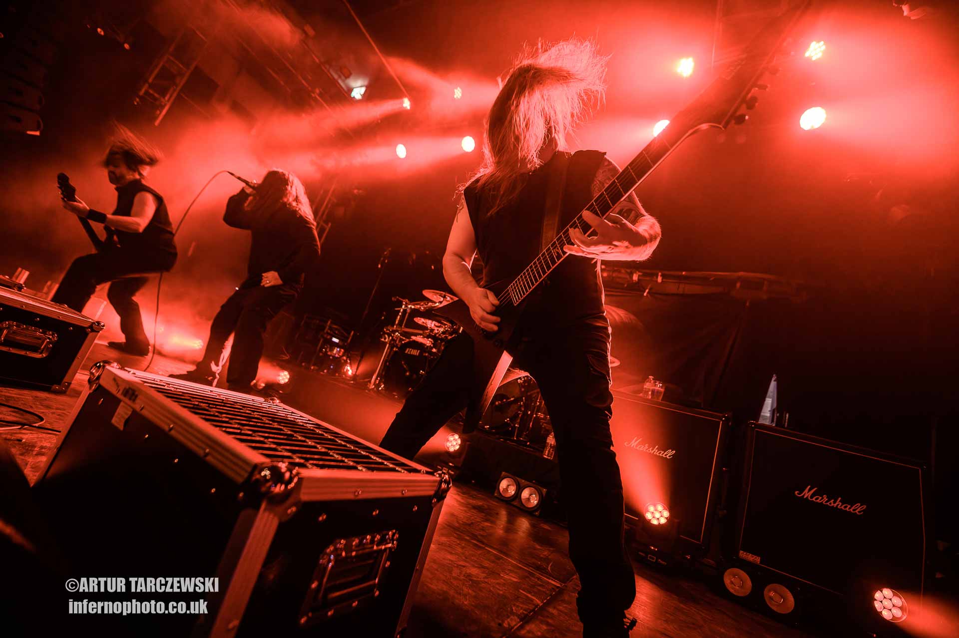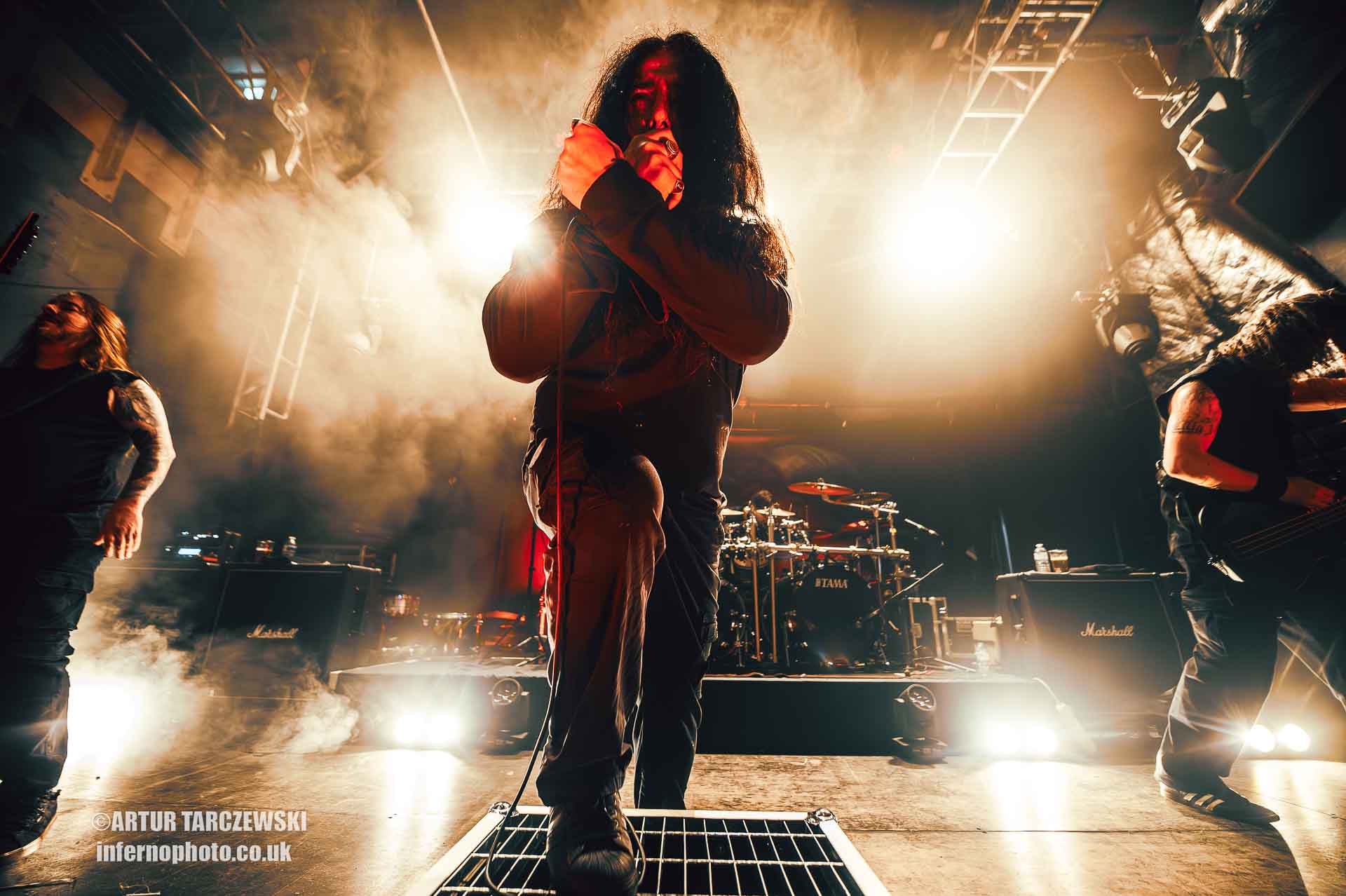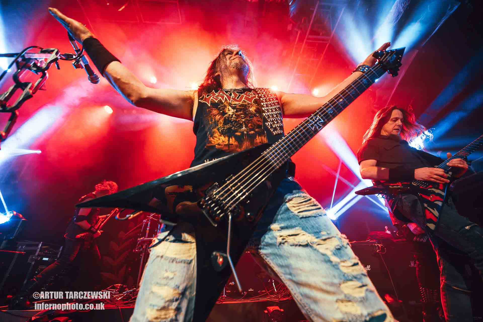 Frontman Piotr “Peter” Wiwczarek commanded the stage like a general leading a battalion into war. Behind him, Marek “Spider” Pająk and Tomasz “Hal” Halicki flayed the strings with an almost surgical ferocity, while drummer James Stewart delivered blast beats that felt like machine-gun fire. The band carved through “Reign Forever World” with merciless efficiency, the crowd answering every verse with howls and fist pumps that could have toppled buildings.