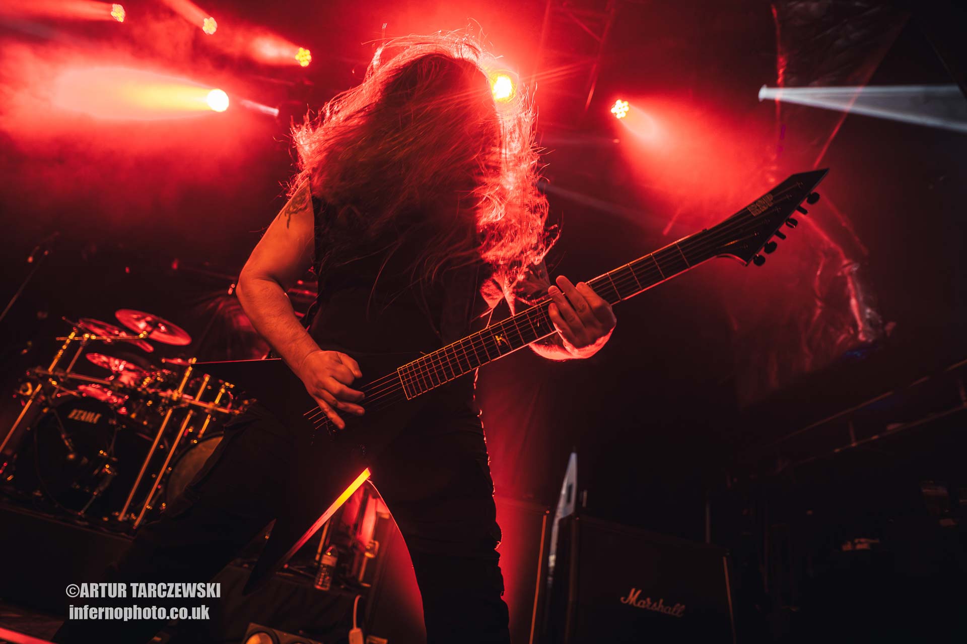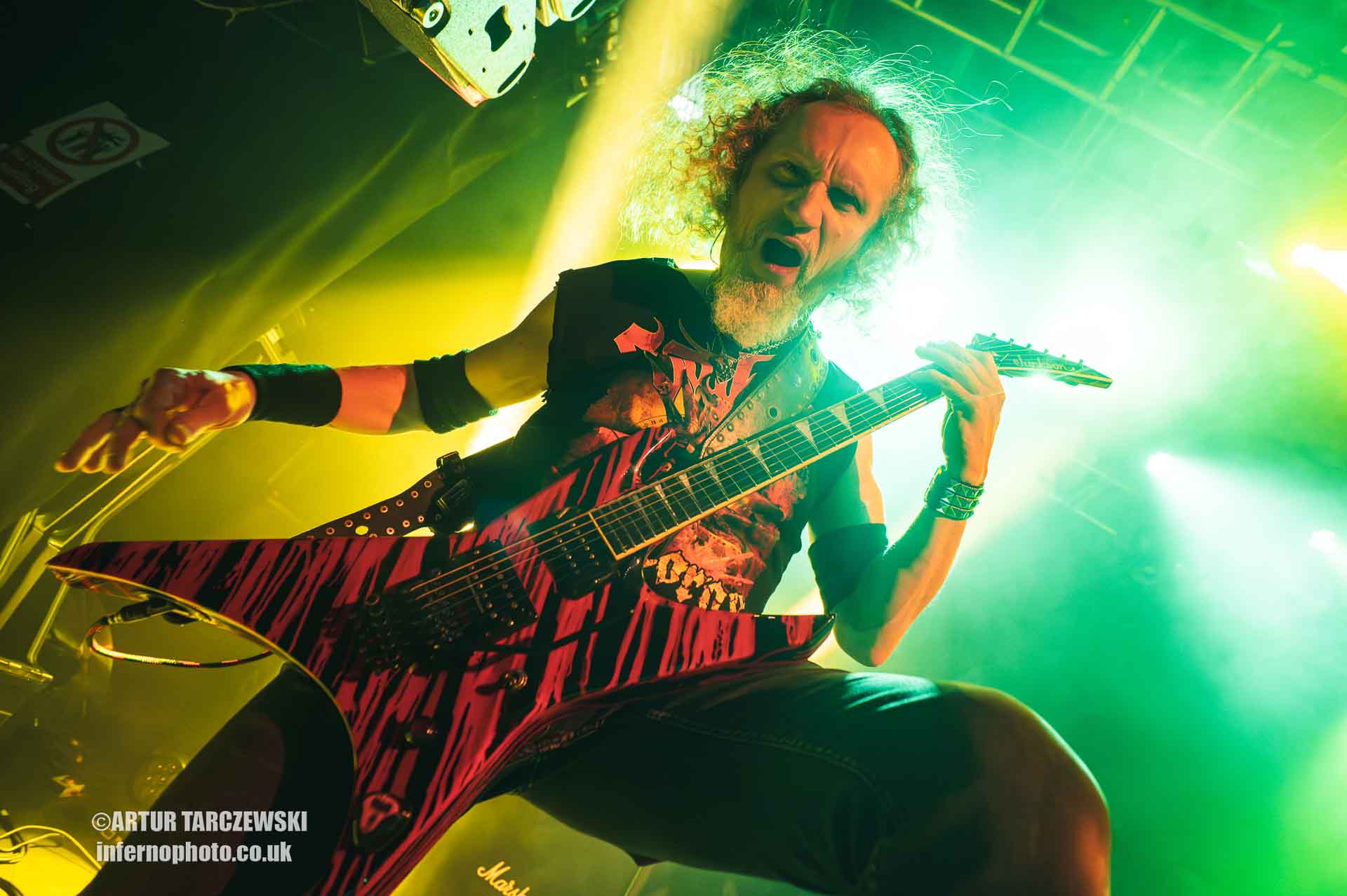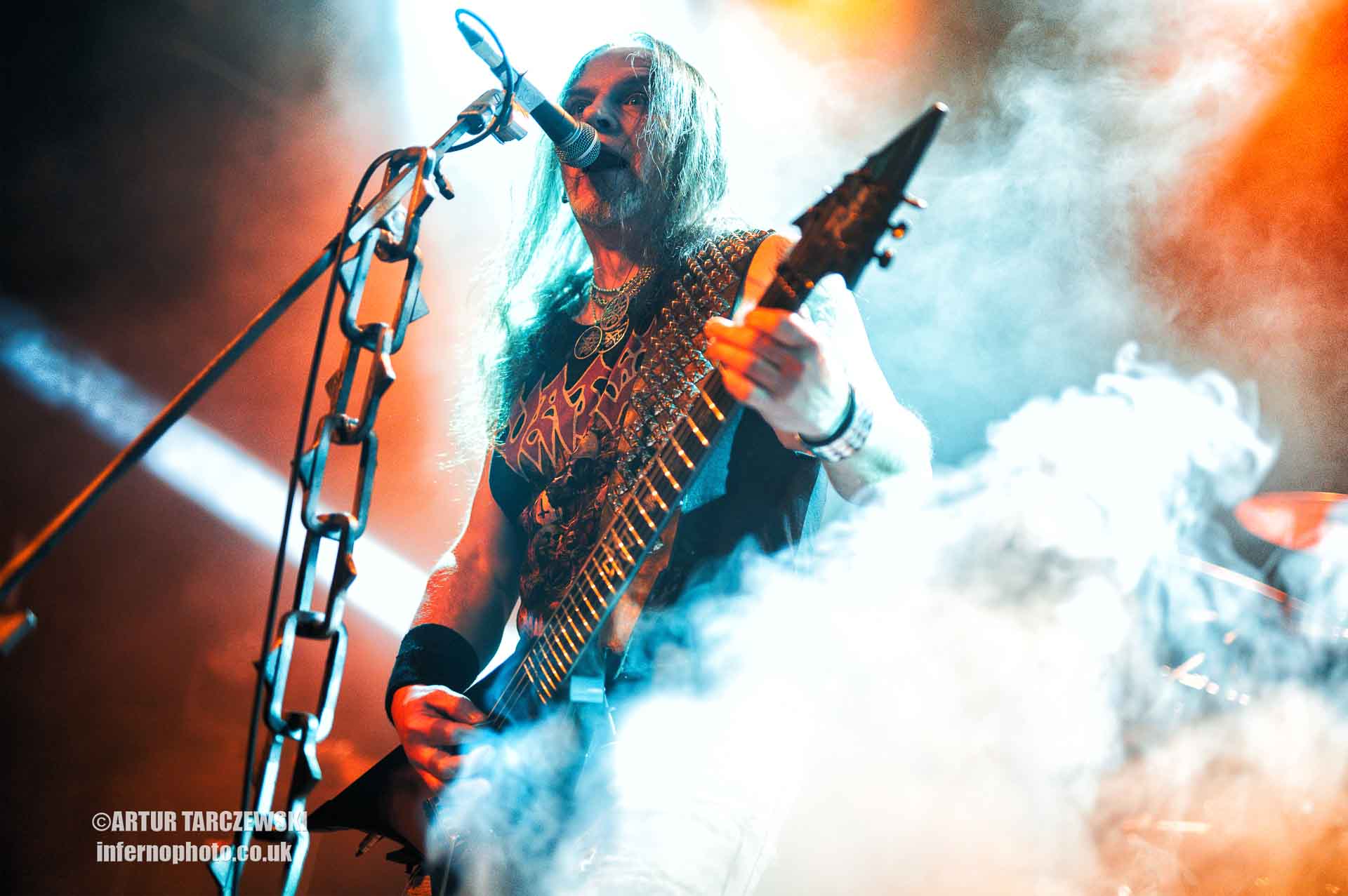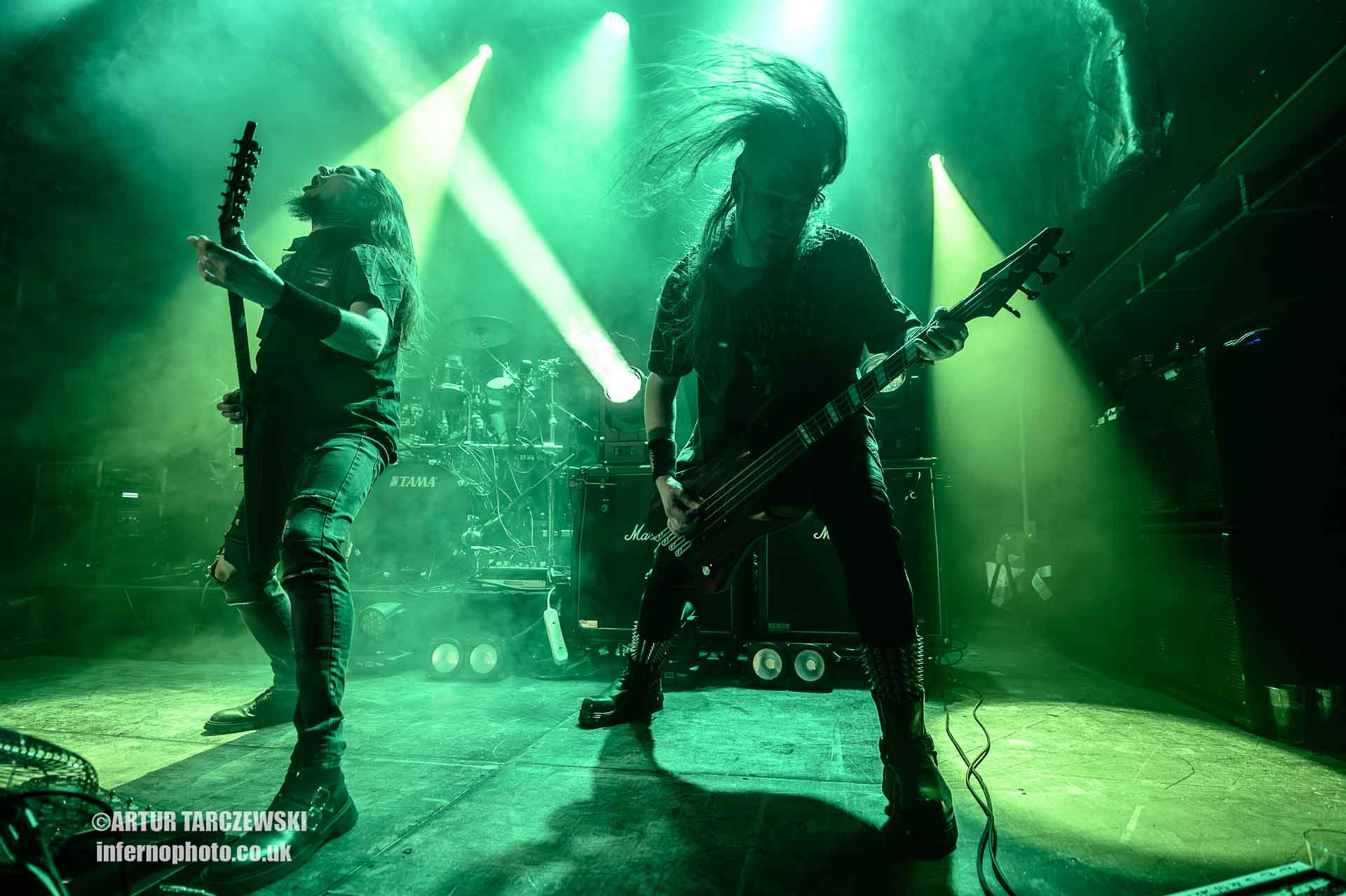 Frontman Piotr “Peter” Wiwczarek commanded the stage like a general leading a battalion into war. Behind him, Marek “Spider” Pająk and Tomasz “Hal” Halicki flayed the strings with an almost surgical ferocity, while drummer James Stewart delivered blast beats that felt like machine-gun fire. The band carved through “Reign Forever World” with merciless efficiency, the crowd answering every verse with howls and fist pumps that could have toppled buildings.