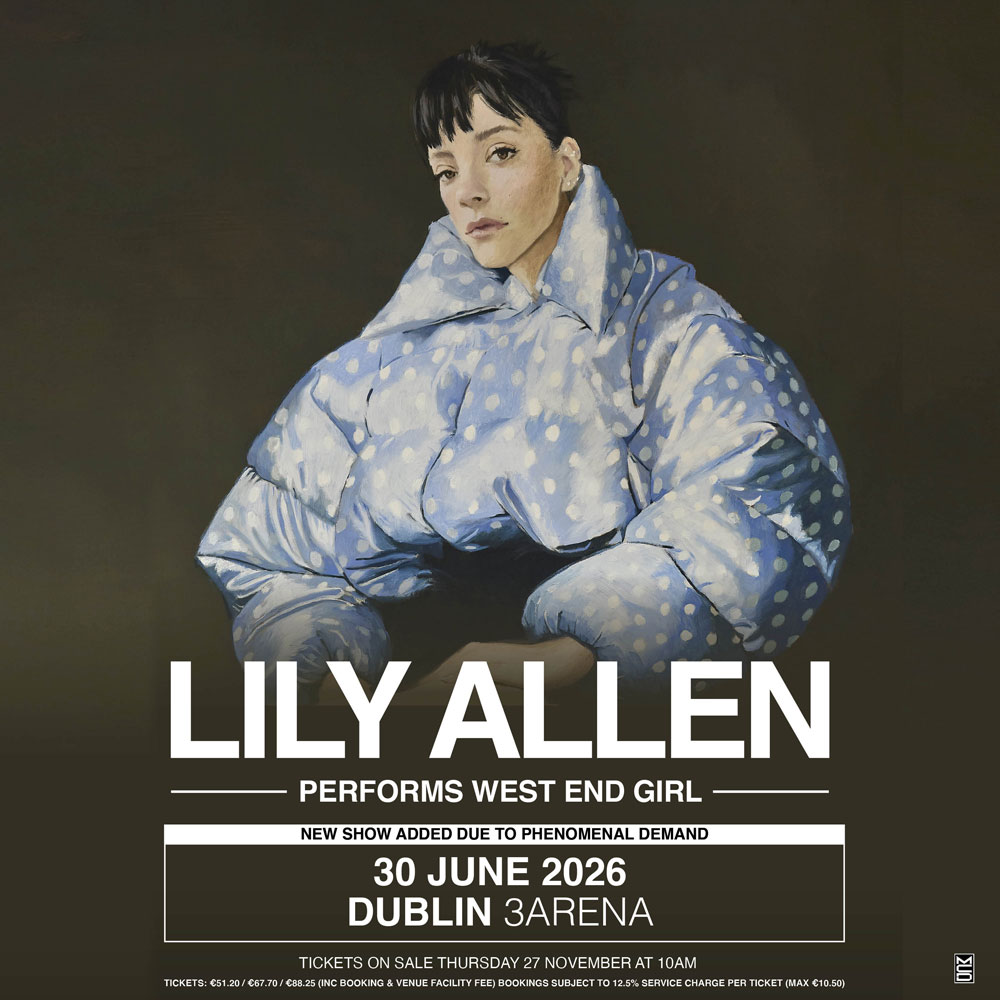 The remarkable Lily Allen, whose highly acclaimed album West End Girl has become a massive global success with over 150 million streams, and a third consecutive Top 5 position on the UK Albums Chart, has today announced a new run of live dates. Following phenomenal public demand for her instantly sold-out theatre shows in March 2026, Lily will return for UK and Ireland arena dates in June 2026. These shows will mark Lily’s biggest headline tour of her career. Lily Allen has just announced her highly anticipated headline show in the 3Arena, Dublin on Tuesday 30th June 2026.