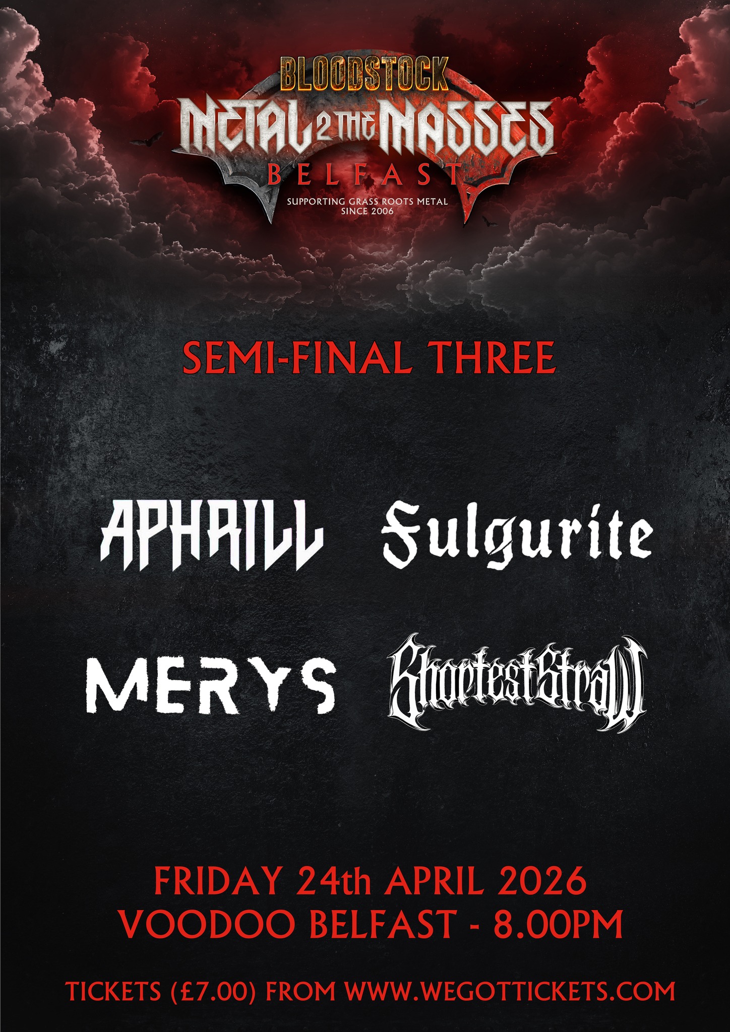 The 3rd and final semi-final of the 2026 Metal 2 the Masses NI competition is a mere 7 days away. This final round will give us the last 2 bands for the Grand Final and is your last chance to vote this year! Pack the room and make your choice! Ticket link and details below.