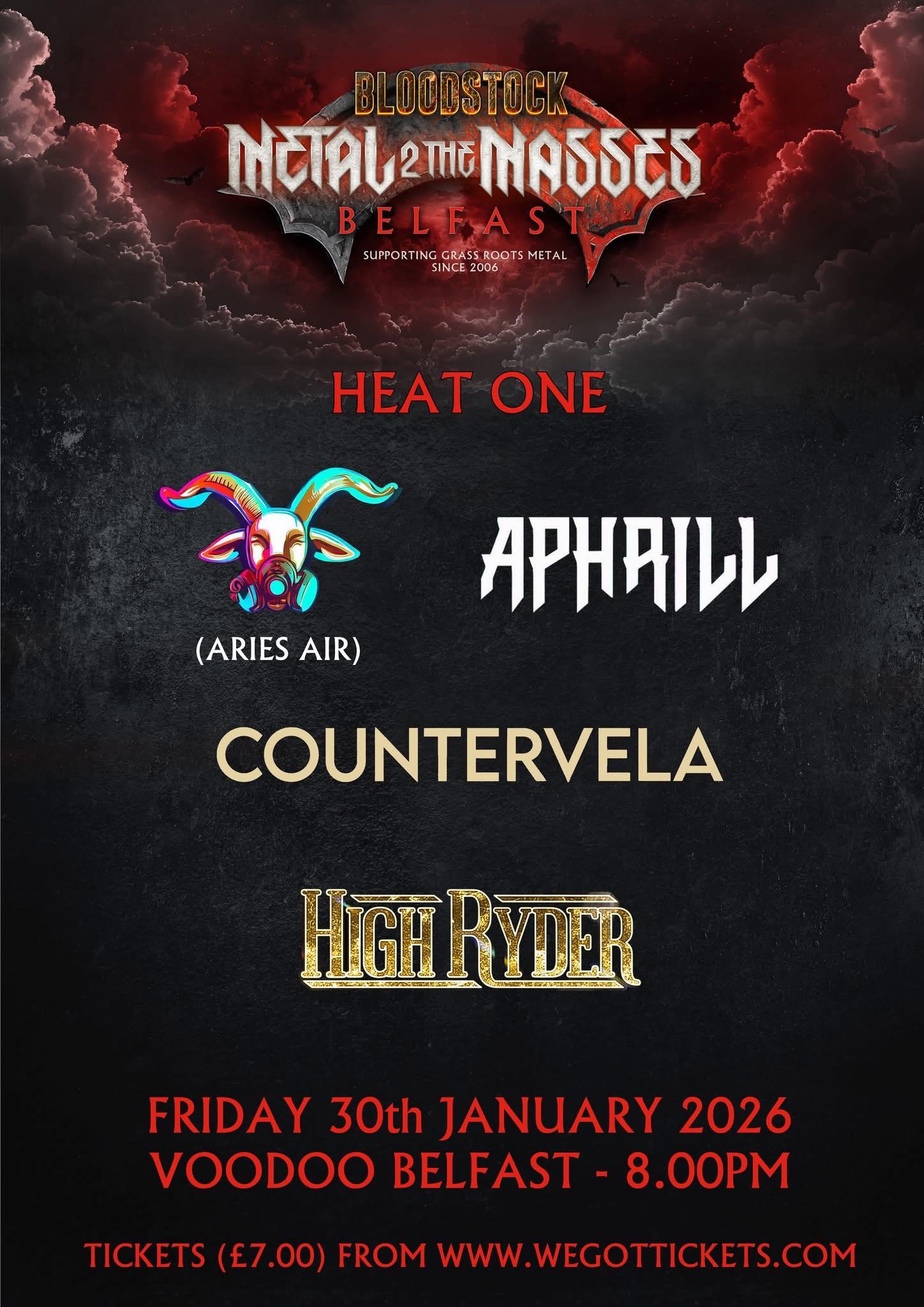 Congratulations to Aphrill Official and Airies Air on going through to the semi’s from last night’s Metal 2 the Masses NI Heat ONE. Not a lot to choose between the 4 bands. Brilliant performances all round and a superb turnout too! Thanks to all who came. Heat 2 this Friday, 6th Feb.