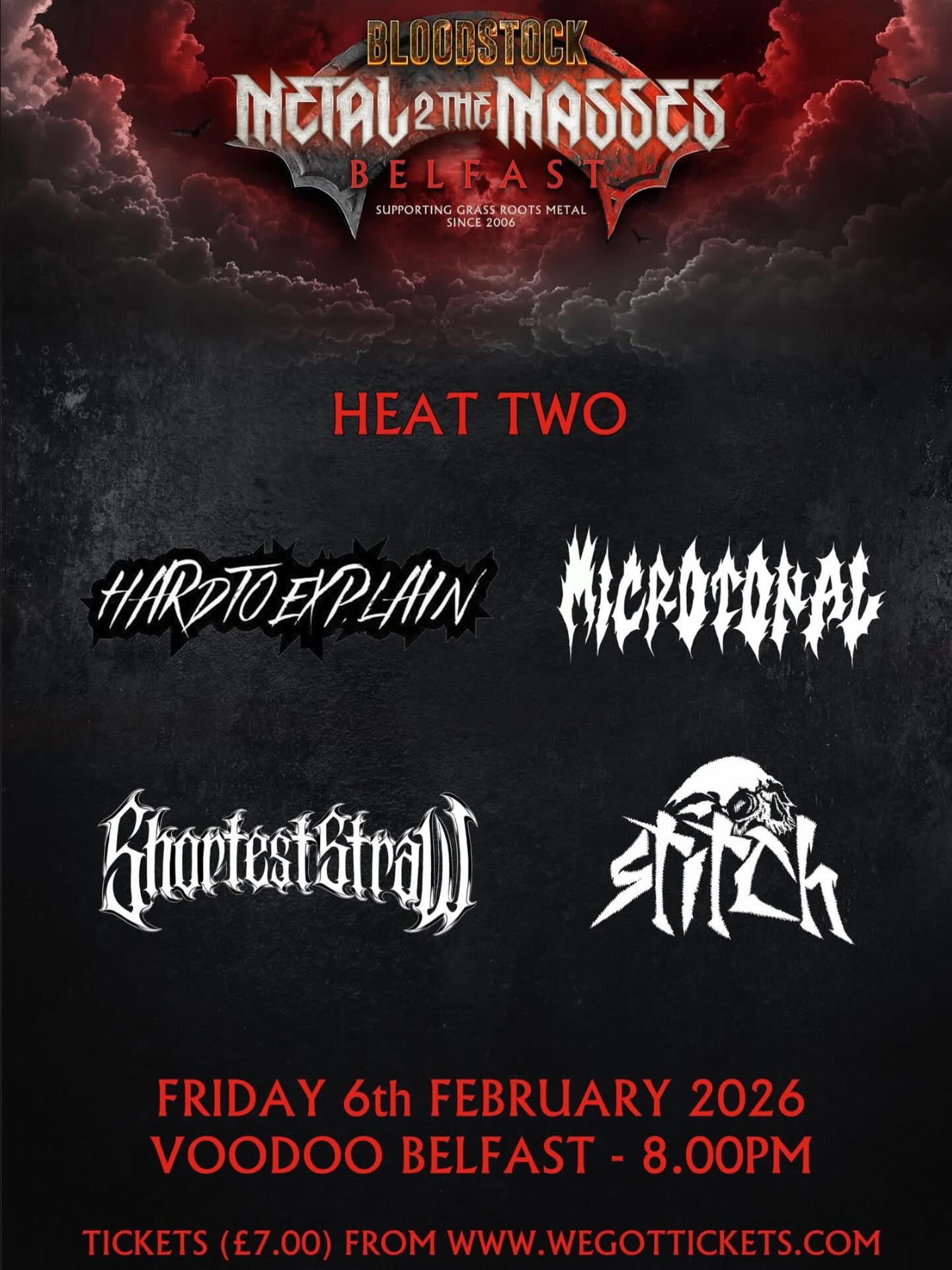 Metal 2 the Masses NI continues this week with Heat TWO and it’s a massive line-up. Hard To Explain, Microtonal, Shortest Straw & Stitch Will battle it out on Friday 6th Feb in Voodoo Belfast for a place in the semi-finals. 2 bands will go through and doors are 8 pm. Tickets from the link below.