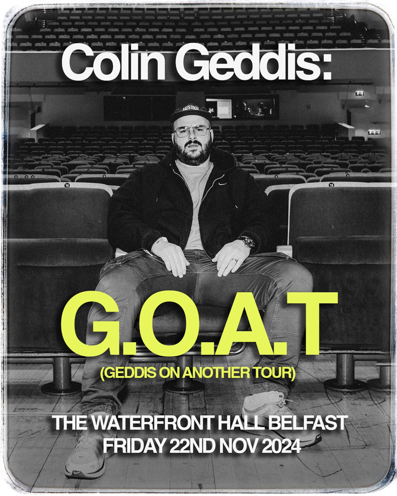 Colin Geddis will perform (for the first time ever) at Belfast’s legendary Waterfront Hall on Friday 22nd November 2024 with his brand new stand up show G.O.A.T. (GEDDIS ON ANOTHER TOUR).