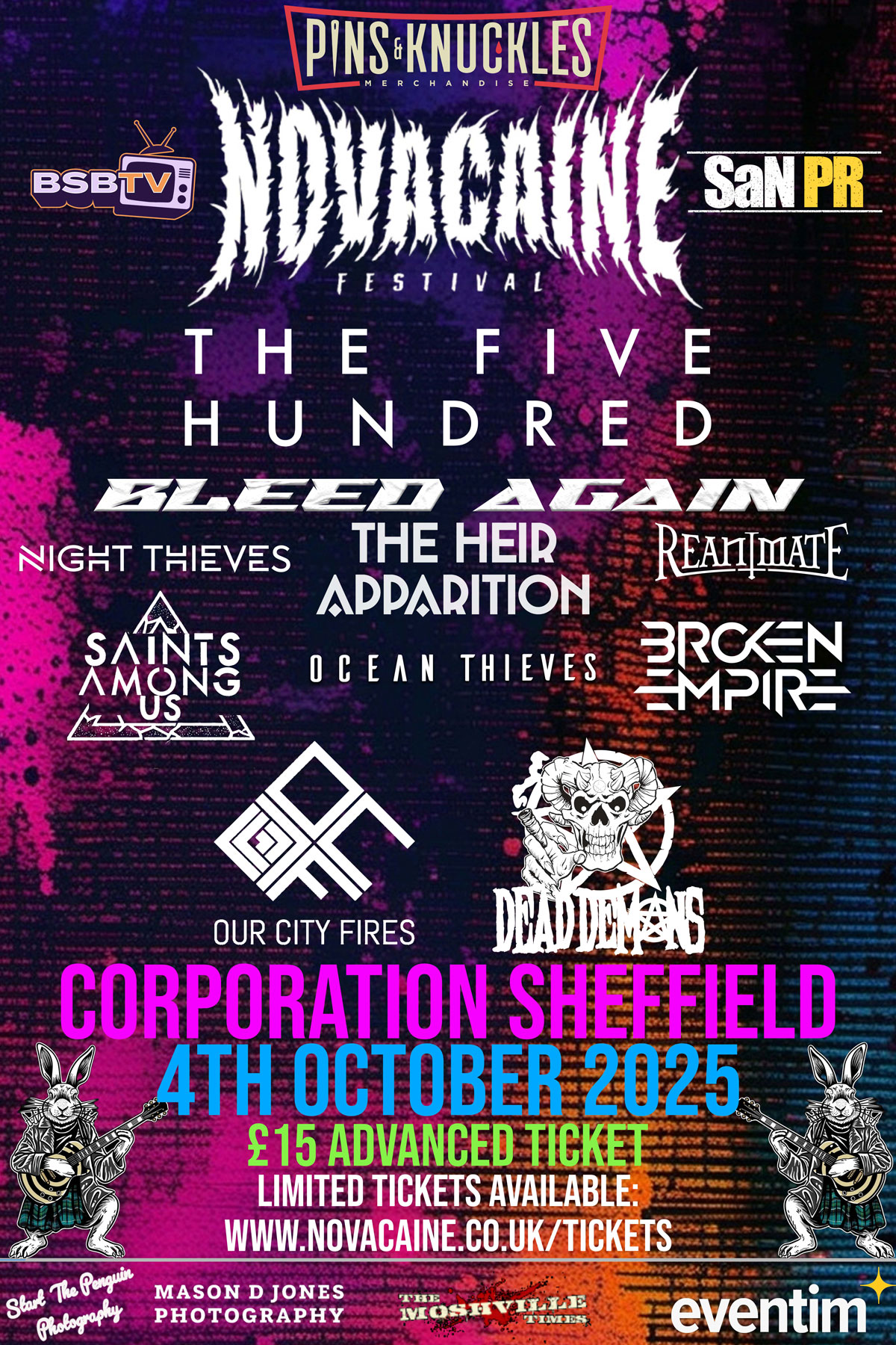 Headlining the 2025’s debut festival is The Five Hundred, a band known for their explosive live performances and growing acclaim across the UK festival circuit. “We’ve seen them grow from the ground up, and their album launch show earlier this year in Nottingham was unreal,” says Scott. Joining them are standout acts Bleed Again, Night Thieves, The Heir Apparition, Saints Among Us, Ocean Thieves, Reanimate, Dead Demons, Our City Fires, and Broken Empire — each bringing a unique flavor of heavy music to the stage. “These bands are the future,” Scott says. “We’re talking serious talent, real energy, and music that deserves to be heard on a bigger stage. Novacaine is here to strengthen that.”