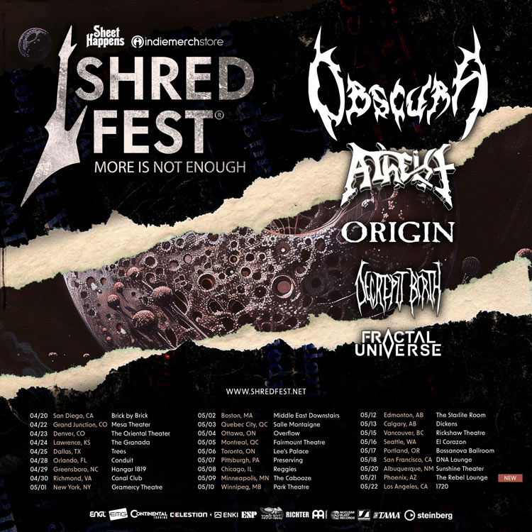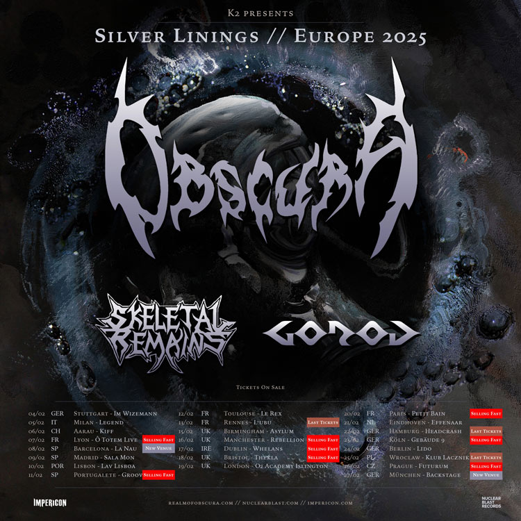 German progressive tech death juggernauts Obscura are on tour celebrating the release of their newest album “A Sonication” with the “A Silver Linings” tour. With them on the tour are California death metal mammoths Skeletal Remains & French tech feathers Gorod.