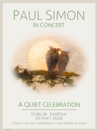 DECEMBER 10, 2025 – Today the legendary singer-songwriter PAUL SIMON announced he will continue “A Quiet Celebration Tour,” following a highly successful and critically acclaimed US tour, and bring this special concert series to Europe, the UK and Ireland this Spring 2026 including a Dublin Show at 3Arena on May 20.