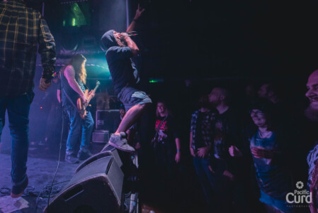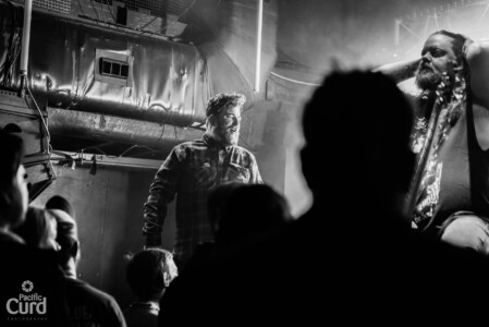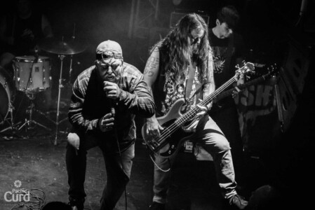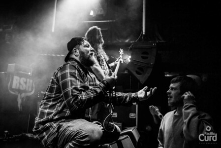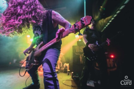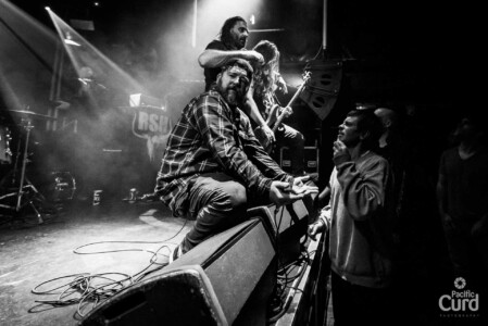 Raging Speedhorn makes a memorable entrance as they prowl around on the stage like a pack of hungry wolves, a continuous brooding chord resounding in the background. ‘’Good evening Bristol!’’ Frank Regan beams amicably down the microphone before proceeding to spread his hands out. The band’s powerful energy is then released which quite frankly blows a hole through the ceiling. Their first song of the evening ‘Hard to Kill’ smashes into the room like a tsunami of complete and utter noise (though technically well executed noise), and there are gnarly faces to be seen left right and centre. By their fourth song, ‘Iron Cobra’’, we were surprised that the two vocalists’ throats hadn’t caught fire and burnt off yet. You can sense the audience becoming more involved at this one too as they start headbanging more aggressively. Frank Regan flips the bird at the audience and growls at them to shuffle forwards, before the band turn their backs for a moment and launch straight into ‘Motorhead’, a speedier tune revealing the bands hardcore punk elements. During one of their more haunting songs ‘Bring out your Dead’, a creepy grim reaper-style ghoul becomes apparent on the backdrop and in the dim light of the venue appears to stand out in an eerily realistic way. We are not sure if this was intentional or not, but it certainly added to the ‘ambience’ of the evening. The music becomes at least two times more aggressive at ‘Snakebite’, which we’d describe as the musical equivalent of the devil spitting on the crowd. Actually, the band was so sonically intense that we actually had to take a little break at one point! On our adventures we found some extreme hot sauce on sale at their merch stand. Upon returning, the lead singer appeared to be treating the audiences to some suggestive belly dances and advanced microphone swinging techniques (we hope the sound engineer didn’t have a heart attack at this point). Clearly a band not short on humour and willing to have a laugh, Speedhorn actively engages with their audience and provides one hell of a sonic punch. If you like aggressive music, hardcore punk, sludge metal and you enjoy having your socks violently blown off, check out this band.