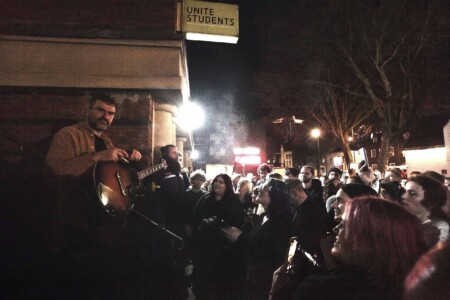 The mid-section of the set features a few of the band’s earlier hits strung together, debut album megahits and late noughties festival favourite Open Your Window and Heavyweight Champion of the World bookend 2012’s Shine the Light, which is introduced as “The best song on Fifa”, leaving the room pumped up and insatiable for more. There are a few interesting treats in store as the regular set draws to a close too, McClure gives up the limelight and takes up the guitar for Cosens to get behind the keys and lead the room with a rendition of his own Auld Reekie Blues, before The Ramona Flowers’ Steve Bird comes out to duet with McClure on new single Problems. Having impressed on keys, Laura McClure makes the switch to trumpet as the band finish with upbeat britpop stonker Silence is Talking from 2009’s A French Kiss in the Chaos, with every blast of the horn echoed back verbally as the crowd engaged in a mass singalong. Just as we think it’s all over however, the reverend grabs an acoustic guitar and makes a beeline for the exit, leading a surprised and delighted throng out to the street for a final singalong. Making his way up some stone steps, he pauses to light a cigarette, telling us “You’ve just had an hour-and-a-half, I’m having a fag break first” before skanking his way through The Specials’ A Message to You, Rudy. Making his escape through the crowd as he darts back to the venue, McClure leaves many awestruck and happy punters in his wake. An example of live music at its very best.