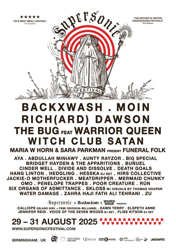 Supersonic Festival 2025 proudly features three UK exclusive performances as part of its genre-defying line-up. Backxwash returns with the first-ever live outing of her forthcoming album Only Dust Remains, marking an exciting evolution beyond her acclaimed trilogy. Sweden’s Funeral Folk (Maria W Horn & Sara Parkman) make their UK debut with a ritualistic and emotionally charged exploration of death and renewal. And from Norway, Witch Club Satan bring their fierce feminist Black Metal to UK soil for the first time—a spell-casting, sensory onslaught like no other, honouring the voices of persecuted women through blazing visuals and uncompromising sound.