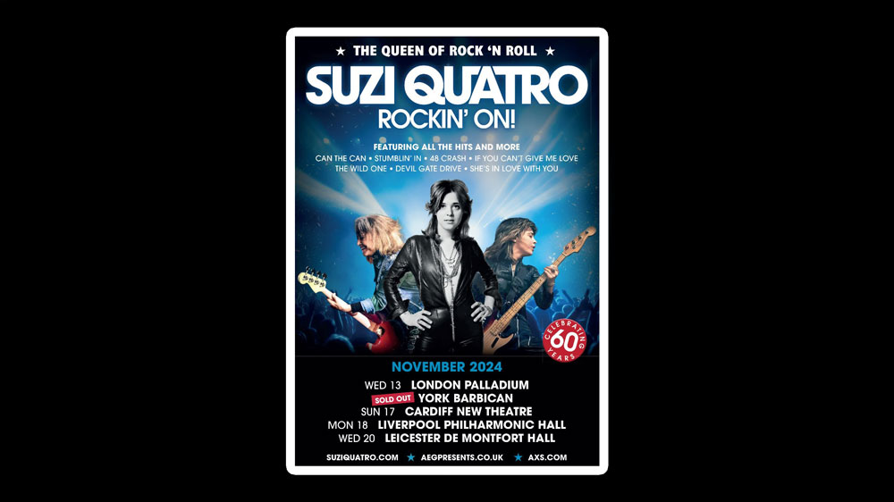 In 2024, Suzi Quatro will mark the 60th year of her reign as the Queen of Rock and Roll by embarking on a 5-date tour of some truly prestigious UK venues in November. Tickets will be on sale from 10am on Friday 1st March 2024 from https://www.aegpresents.co.uk/event/suzi-quatro