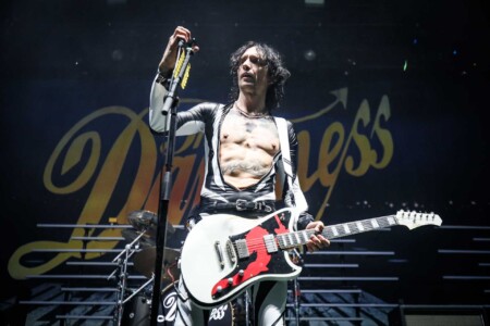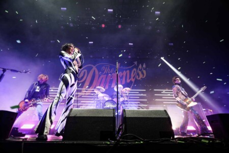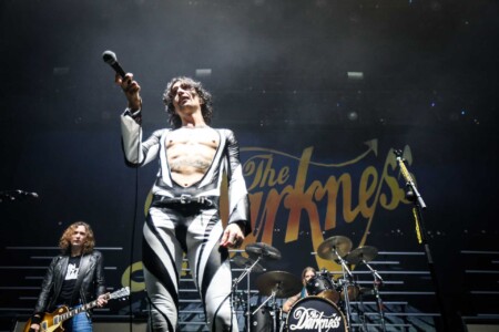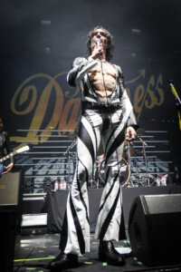 As the lights dimmed and the crowd roared in anticipation, The Darkness emerged on stage with frontman Justin Hawkins leading the charge. Dressed in their trademark glam-rock attire, the band wasted no time in launching into the opening chords of “Black Shuck,” the infectious track that first introduced the world to their electrifying sound.