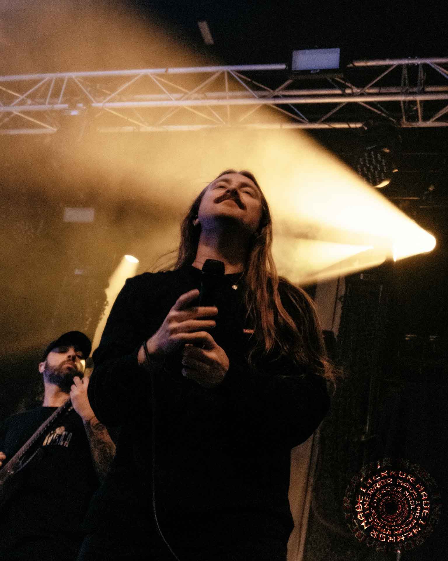 Landon’s presence was magnetic. The other members remained focused on their instruments, letting him carry the emotional weight and crowd interaction. His voice—cutting, smooth, and full of controlled power—shifted seamlessly between harsh and clean sections, proving his consistency as one of metalcore’s most dynamic vocalists. During a quieter section, a single lamp hung above him, casting a soft glow as he sang the opening to Silence. It was haunting and intimate, the kind of moment that pulls a full venue into stillness. Later, when he demanded more crowd surfers, the response was immediate—bodies flying overhead as the band tore into their heaviest material.