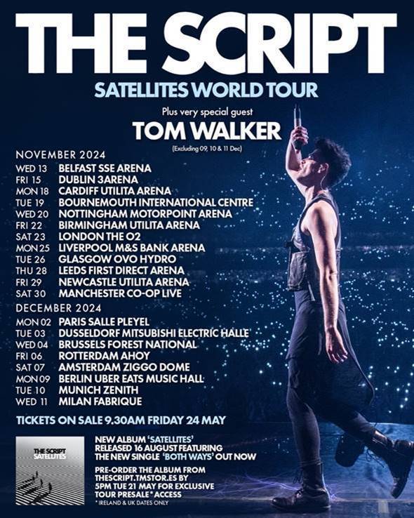 After reuniting for select shows of collective grieving and joyous communion with The Script family in 2023, the band are about to head out on a massive tour supporting P!nk across the UK, Europe and America before returning to big stages of their own this autumn. This will see them play to over 2 million fans around the world this year. Tour support comes from very special guest Tom Walker on all dates except Berlin, Munich and Milan.