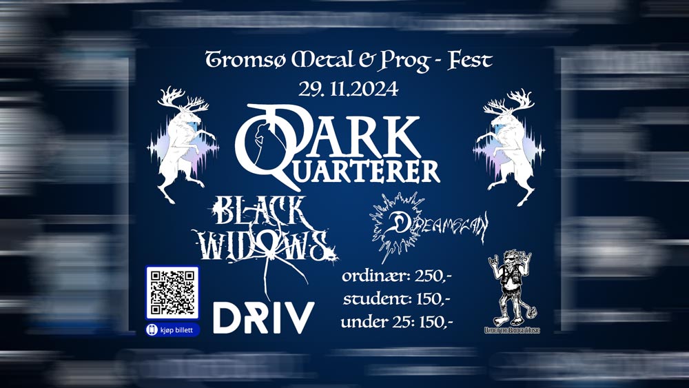 The third edition of Tromsø Metal & Prog – Fest will take place during the polar night on the 29th of November 2024, far north of the polar circle in the city of Tromsø, Norway. The festival is proud to present a dynamic line-up consisting of Dark Quarterer, the proud front runners of epic progressive metal; Black Widows, melodic death metal veterans from Portugal; with support from local Tromsø epic progressive metal trio Dreamslain.