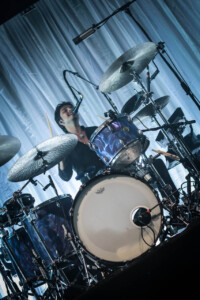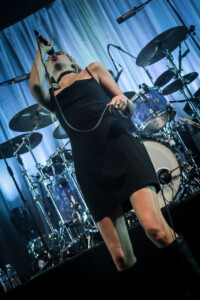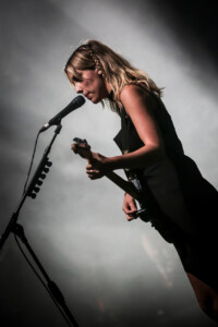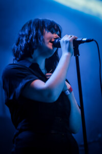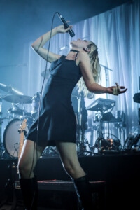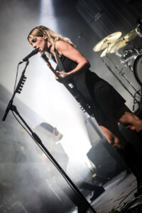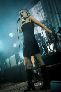 Ellie takes to the drum riser, hit with a spotlight and casting a dramatic silhouette for ‘Safe From Heartbreak’, it’s a stunning moment in the set, one of many that showcases what an excellent vocalist she is and it’s clear that on the newer material the band lean into this much more, allowing space for her voice to shine. Then we get to ‘Play the Greatest Hits’, it’s a whirlwind of distortion and energy with Ellie prowling the stage like a caged animal, pulling shapes and screaming ‘it isn’t loud enough. The song gets faster every time I see them play it. ‘Silk’ see’s Joel bring out the mallets for the drums, it’s haunting and beautiful and a personal favourite, my only criticism being, ironically, it isn’t loud enough. ‘Visons of a Life’ is a tour de force live, and acts as a microcosm for the set, moving from piece to piece, mood to mood. ‘Moaning Lisa Smile’ is a grunge master class and has the crowd singing along, it’s the oldest track we get tonight but feels at home amongst the rest of the material. ‘No Hard Feelings’ see’s Joff pick up the bass and the band leave the stage leaving just him and Ellie, it’s a great moment and helps add to the poignancy of the track.