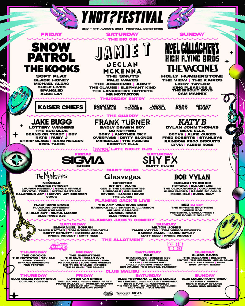 Jason Oakley, Managing Director at Y Not Festival, says: “Firstly I want to thank everyone who supported us again last year, who came along and enjoyed some fantastic music with us in our favourite place. We’re working hard to make this year even better, and we’re beyond excited to share 2024’s line-up with you. Heading to Pikehall this August is Snow Patrol, Jamie T and Noel Gallagher’s High Flying Birds, as well as our Thursday headliners Kaiser Chiefs! There’s a huge line-up across the whole weekend including The Kooks, The Vaccines, Holly Humberstone, Jake Bugg, Katy B, Black Honey and so many more. We can’t wait to welcome you back this year!”