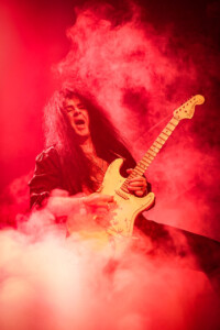 Cometh the hour and cometh the man, a wailing guitar solo rips out from side stage and the crowd goes wild, shizzle is going down! Immediately the band rips into one of Yngwie’s fan favourites and classic hits ‘Rising Force’ and Belfast’s Mandela Hall is bathed in smoke and red light, Yngwie temporarily disappears amidst the smoke, myself and the other two togs despairingly look at each other trying to figure out how to capture anything and take a brief pause for its to settle, suddenly out of the smoke Yngwie is in front of us pointing to the other side of the stage, again confused we look at each other not quite knowing what is going on, Yngwie is busting his best moves, wailing on the guitar and occasionally pointing at us and to move, now at this point in my head I can hear that opening line of Guns ’N’ Roses ‘Civil War’ “What We Got Here Is A Failure To Communicate” Someone failed to communicate that WE were on the wrong side of the stage as per instructions of Yngwie’s management and things had gone little tits up! One stressed bass-player later freaked out trying to get us across to where we were meant to be and Yngwie orchestrated us like little minions we figured it all out and eventually ended up on the opposite side. Phew! So amidst this chaos, I have to confess I can’t even remember what songs were played, it was all a blur! I was actually grateful when our time In the pit was over and it was time to just sit back and soak up the show.