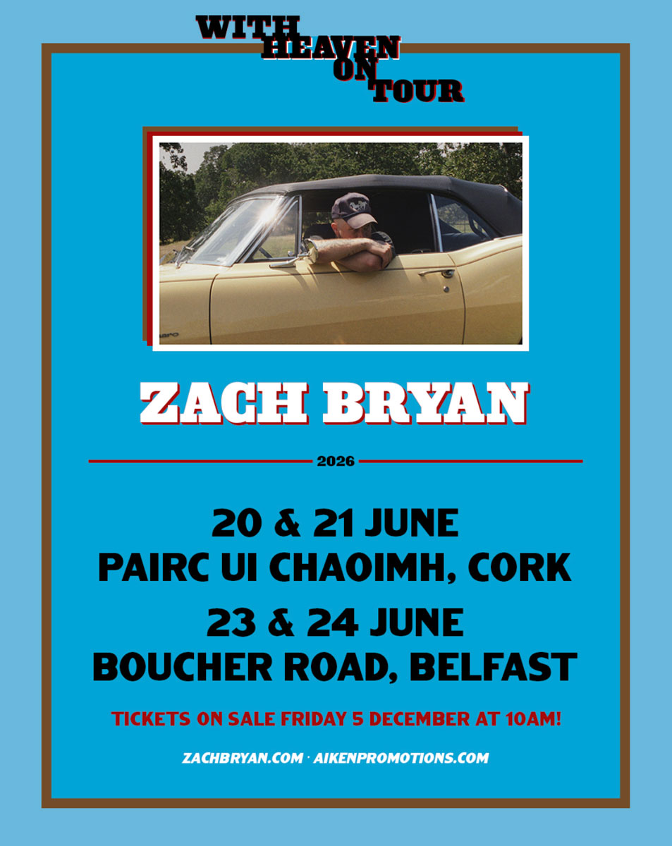 Tickets for Zach Bryan in CORK, Páirc Uí Chaoimh on Saturday 20th & Sunday 21st June 2026 and BELFAST, Boucher Road on 23rd & 24th June 2026 go on sale Friday 5th December at 10am from Ticketmaster.ie
